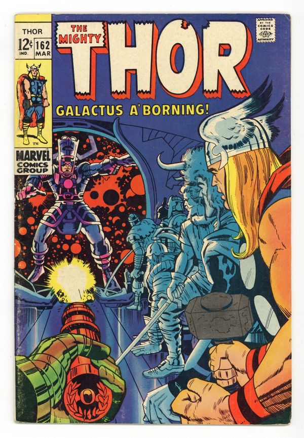 The beginning of the origin of Galactus (continued in Thor 168) in "Galactus is Born!" Script by Stan Lee, pencils by Jack Kirby, inks by Vince Colletta. Appearances by Balder, the Recorder, Hogun, Fandral, Volstagg, and Odin. Cameos by Galactus, Karnilla, and Heimdall. Kirby/Colletta cover. Cover price $0.12. Grade: VG+ 4.5 explanation of grade Condition: Used (collectible)