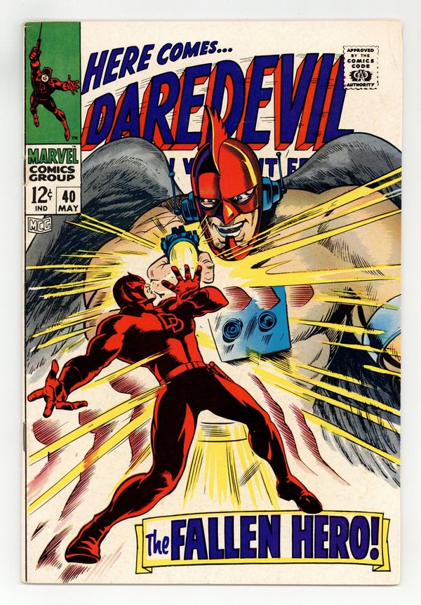 Cover pencils by Gene Colan, inks by John Tartaglione. The Fallen Hero, script by Stan Lee, pencils by Gene Colan, inks by John Tartaglione; Throwing down with the Unholy Three, Daredevil is zapped with the Exterminator's time displacement gun and zapped into limbo, possibly for eternity (or at least until next issue). Letter to the editor from comics writer Mark Gruenwald. 36 pgs. Cover price $0.12. Cover price $0.12. Grade: FN 6.0 explanation of grade Condition: Used (collectible)