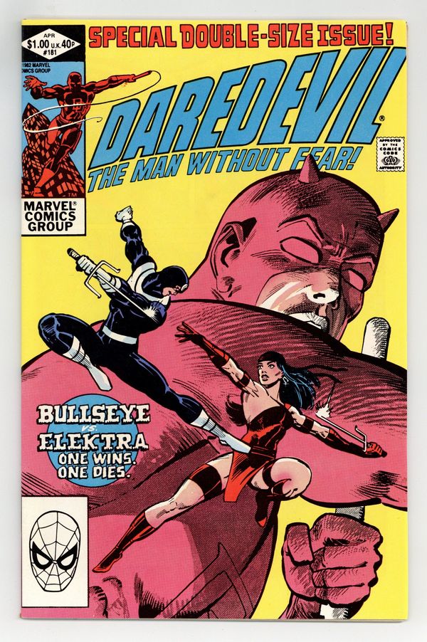 Direct Edition. Cover pencils by Frank Miller, inks by Klaus Janson. Last Hand, script by Frank Miller, pencils by Frank Miller (breakdowns) and Klaus Janson (finished art), inks by Klaus Janson; Bullseye breaks out of prison; Elektra hunts down Foggy and is about to kill him until she recognizes him as Matt's buddy from college; Bullseye fights Elektra and kills her with her own sai; DD goes after Bullseye and ends up dropping him from a great height, breaking every bone in his body; Kingpin appearance; story narrated by Bullseye; story dedicated to the memory of Wally Wood 1927-1981. Full page pin-up ad for Marvel Fanfare, art by Michael Golden. Statement of Ownership average # of copies in preceding 12 months: 276,812 Cover price $1.00. Grade: VF 8.0 explanation of grade Condition: Used (collectible)