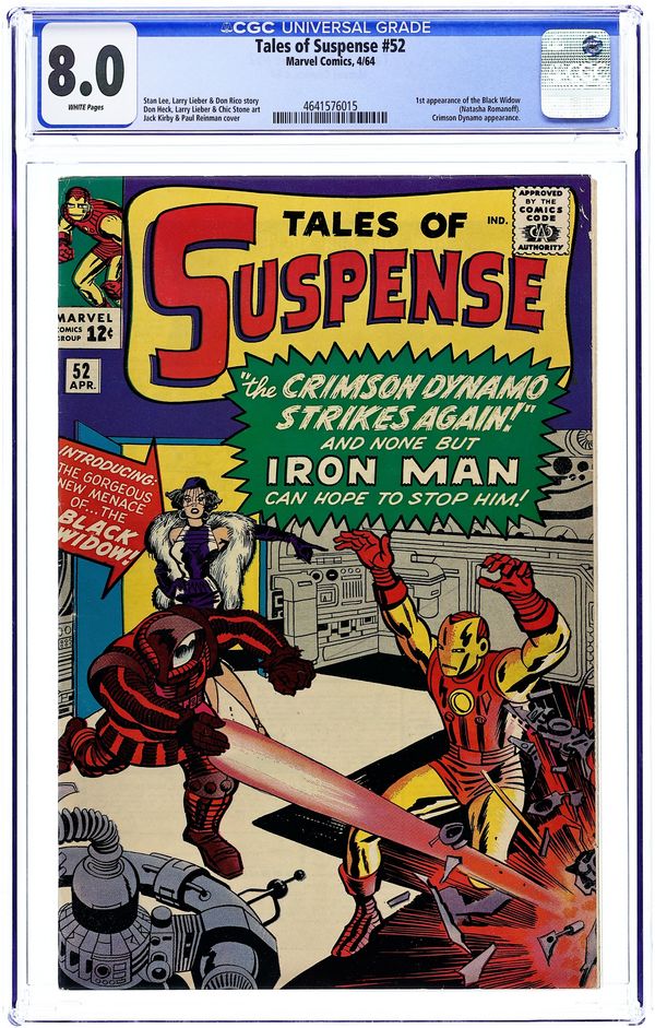 Starts Jan 3 Cover pencils by Jack Kirby, inks by Paul Reinman. First appearance of the Black Widow in "The Crimson Dynamo Strikes Again!", script by Stan Lee (plot) and Don Rico (as N. Korok), art by Don Heck; The Black Widow and Boris are sent to America to kill Anton Vanko, the Crimson Dynamo, for defecting to America; They are also tasked with killing both Iron Man and Tony Stark. The first half of "The Magician" text story. "The Seance!", script by Stan Lee (plot) and Larry Lieber, pencils by Larry Lieber, inks by Chic Stone; A fake medium uses special effects to simulate supernatural powers, but he is taken into the spirit world by real ghosts as punishment. "The Failure!", script by Stan Lee (plot) and Larry Lieber (script), pencils by Larry Lieber, inks by Paul Reinman; The Earth of the future is overwhelmingly materialistic, except for one idealistic young man and his lover; They are abducted by aliens, who have determined that he is the best suited to be absolute ruler of their empire. This issue includes a statement of ownership - average print run, 318,932; average paid circulation, 188,005. 36 pages, full color. Cover price $0.12. Grade: CGC 8.0 explanation of grade Condition: Used (collectible)