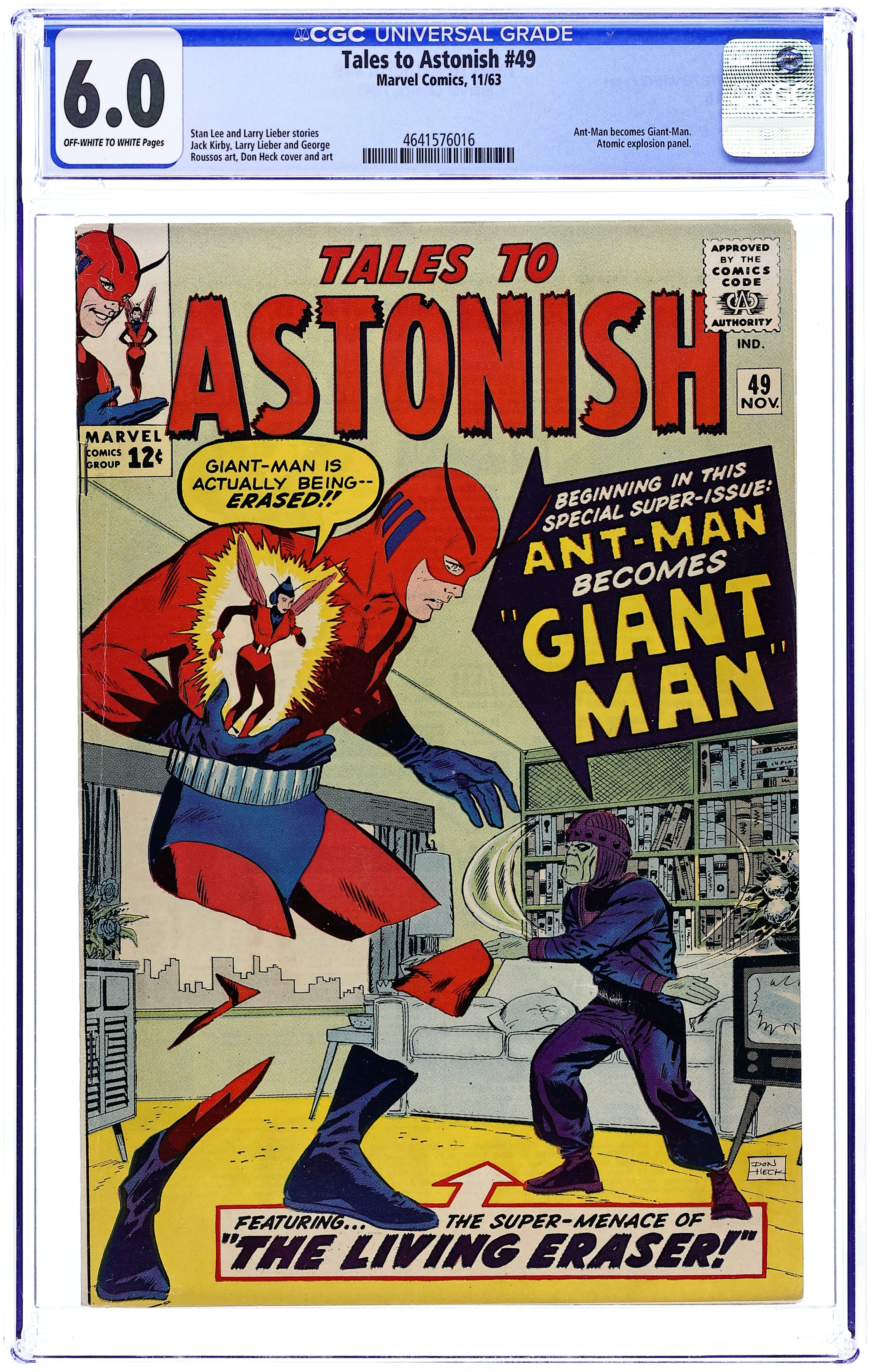Starts Dec 15 Cover by Don Heck. The Birth of Giant-Man!, script by Stan Lee, art by Jack Kirby and Don Heck; While Henry Pym develops capsules that permit him to become giant-size as well as ant-size, the Eraser captures him and brings him to Dimension Z along with other scientists to build atomic weapons. Odd Skills text story, art by Joe Maneely. The End of a World!, script by Stan Lee and Larry Lieber, art by Larry Lieber and George Roussos [as G. Bell]; A ruler orders the destruction of an uninhabited galaxy as a tribute to his power. 36 pgs., full color. $0.12. Cover price $0.12. Grade: CGC 6.0 explanation of grade Condition: Used (collectible)