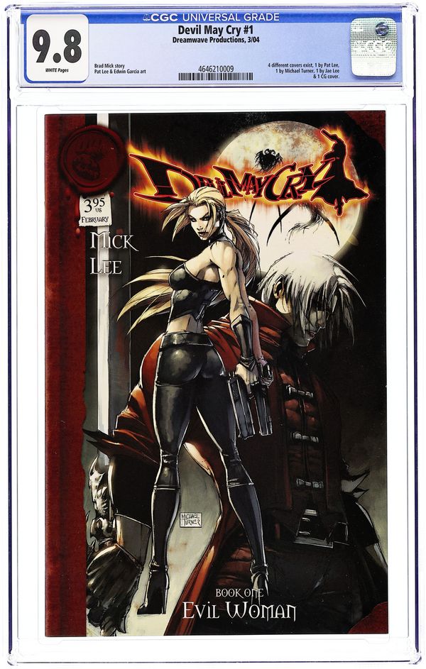 Written by Brad Mick; Art by Pat Lee Dante leaps from the video game screen to the comic page in Dreamwave's new series Devil May Cry. In this issue, Trish gets the lowdown on the enigmatic Dante, as we watch the half demon/half human gun-for-hire do what he does best--but is it enough when this merc with a mouth goes blow-for-blow against the demon lord known as Phantom? NOTE: This issue will ship with 4 covers in equal ratio. Artists include Jae Lee, Michael Turner, a CGI cover, and Pat Lee! FC, 40pg$3.95Monthly Cover price $3.95. Grade: CGC 9.8 explanation of grade Condition: Used (collectible)
