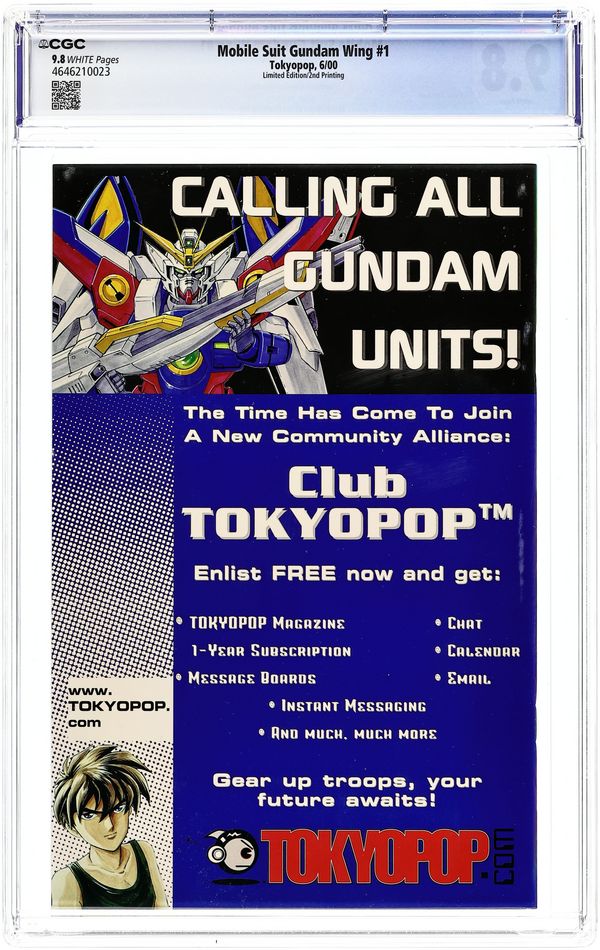 It is the year A.C. 195. After two decades of oppression, a network of space-based rebels strike back at their opposing force, OZ. Using super-strong armor called gundanium, scientists construct advanced mobile suits called Gundams. Five highly-trained combat pilots are dispatched to Earth to wage guerilla war against OZ and its Alliance. Filled with action-packed robotic battles and enough plot twists and turns to give you a G-Force whiplash, Gundam Wing will leave you on the edge of their seat! b&w, 48pg" Cover price $2.95. Grade: CGC 9.8 explanation of grade Condition: Used (collectible)