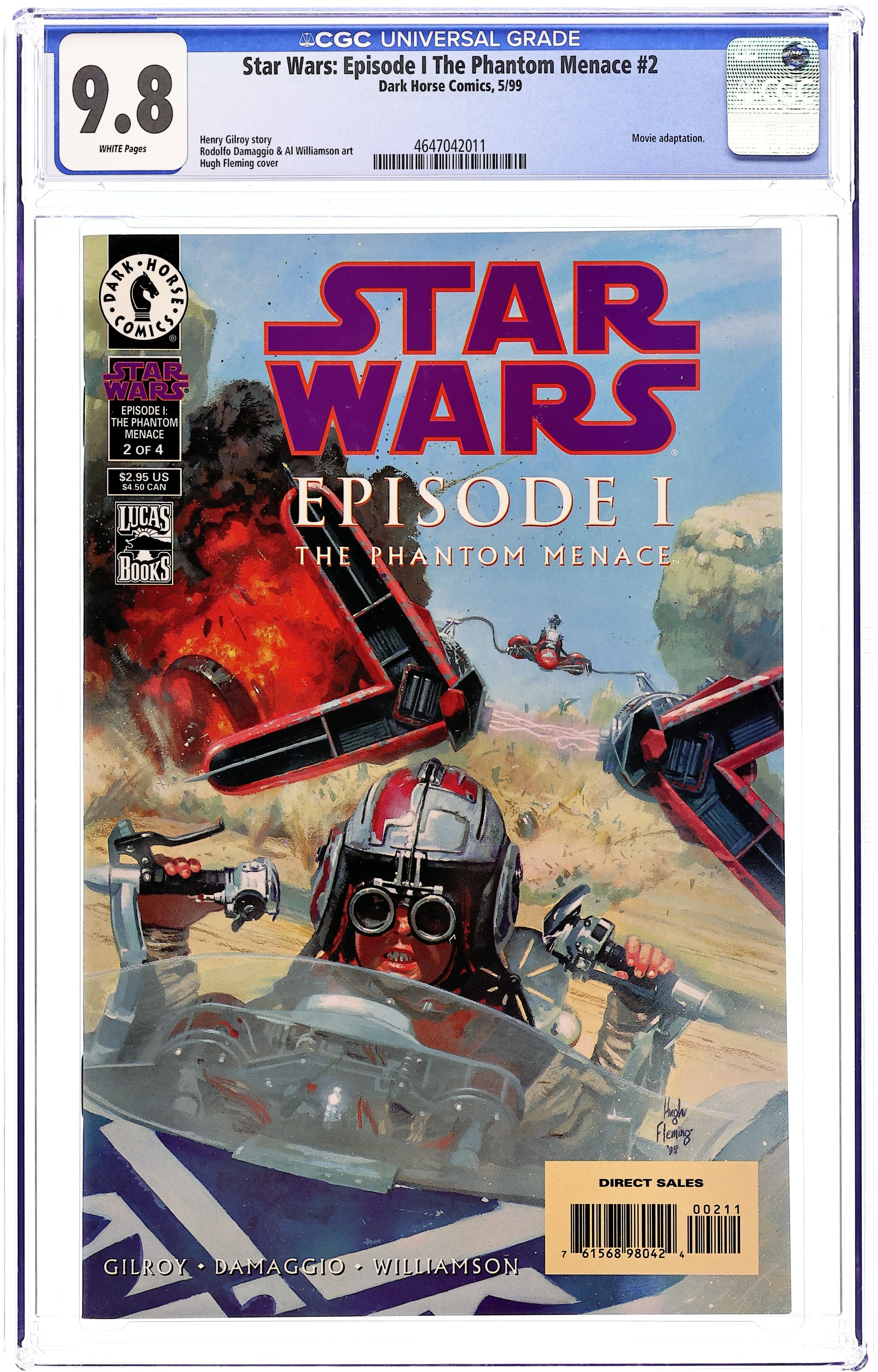 Written by Henry Gilroy. Art by Rodolfo Damaggio and Al Williamson. Cover by Hugh Fleming. Dark Horse Comics proudly presents the comics adaptation of the long-awaited first Episode of the Star Wars saga. Adapted for comics by Henry Gilroy from an original screenplay by master movie maker George Lucas and artfully illustrated by Rodolfo Damaggio and comics legend Al Williamson, make sure you catch this legendary series that's sure to please Star Wars fans of all ages. 32 pages, FC. Cover price $2.95. Grade: CGC 9.8 explanation of grade Condition: Used (collectible)