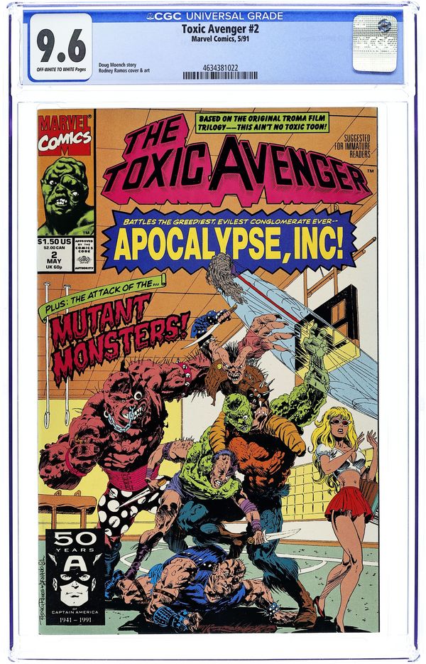 Direct Edition. Written by Doug Moench. Art by Rodney Ramos, Val Mayerik, Al Milgrom, and Keith Williams. Cover by Rodney Ramos and Armando Gil. The Toxic Avenger battles the Mutant Monsters and Apocalypse, Inc. Stan Lee with an April Fools Day joke. Jim Salicrup discusses the background behind this series. 36 pages, full color. $1.50. Cover price $1.50. Grade: CGC 9.6 explanation of grade Condition: Used (collectible)
