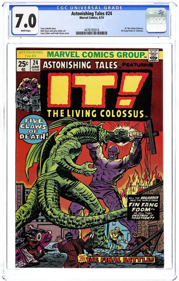 First 25-cent cover price. Cover pencils by Larry Lieber, inks by Frank Giacoia. Five Claws of Death!, script by Tony Isabella, pencils by Dick Ayers, Larry Lieber, Jack Kirby (reprinted material), and Gil Kane (reprinted material), inks by Vince Colletta, Dick Ayers (reprinted material), and Mike Esposito (reprinted material); Fin Fang Foom is again controlled by Dr. Vault and he attacks It forcing him to slip away before he is defeated; Bob O'Bryan then sends his mind back to his body where he wakes up before they can perform an autopsy on him. Advertisement for three official Marvel Solid-Bronze Collectors Medallion-Coins. Stan Lee's Soapbox. Promo for Crazy Magazine #4 and Savage Tales #4. 32 pgs. $0.25. Cover price $0.25. Grade: CGC 7.0 explanation of grade Condition: Used (collectible)