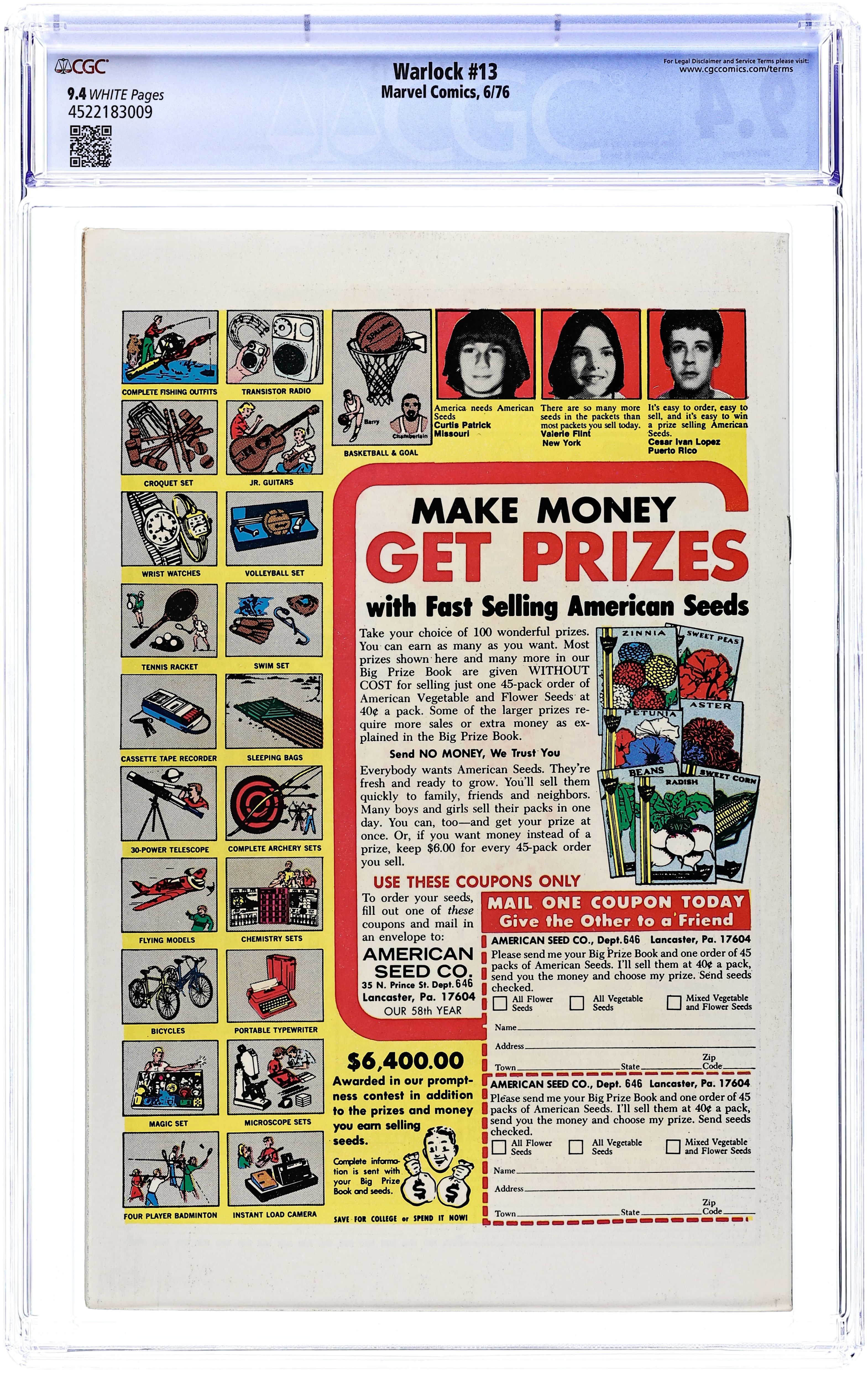 Cover by Jim Starlin. First appearance of the Star Thief in "Here Dwells the Star Thief!", script by Jim Starlin, pencils by Jim Starlin (layouts) and Steve Leialoha (finished art), inks by Steve Leialoha; In Wildwood Hospital lies young Barry Bauman who was born without any of the five senses; As Warlock decides what to do about the phenomena of the disappearing stars he realizes, that the Soul Gem wants him to investigate; He finds a world frozen because of the disappearance of its sun; With the help of the Soul Gem Warlock discovers, that just one Earth man is responsible for the vanishing stars; Barry Bauman is revealed to be the Star Thief; He wants revenge because nobody cared about his condition and before he turns his attention to Earth he wants to transport all surrounding suns into the endless dimension of his omnipotent brain so that the people know his loneliness before he destroys them. Letter to the editor from comics writer Ralph Macchio. 36 pgs., full color. $0.25. Cover price $0.25. Grade: CGC 9.4 explanation of grade Condition: Used (collectible)