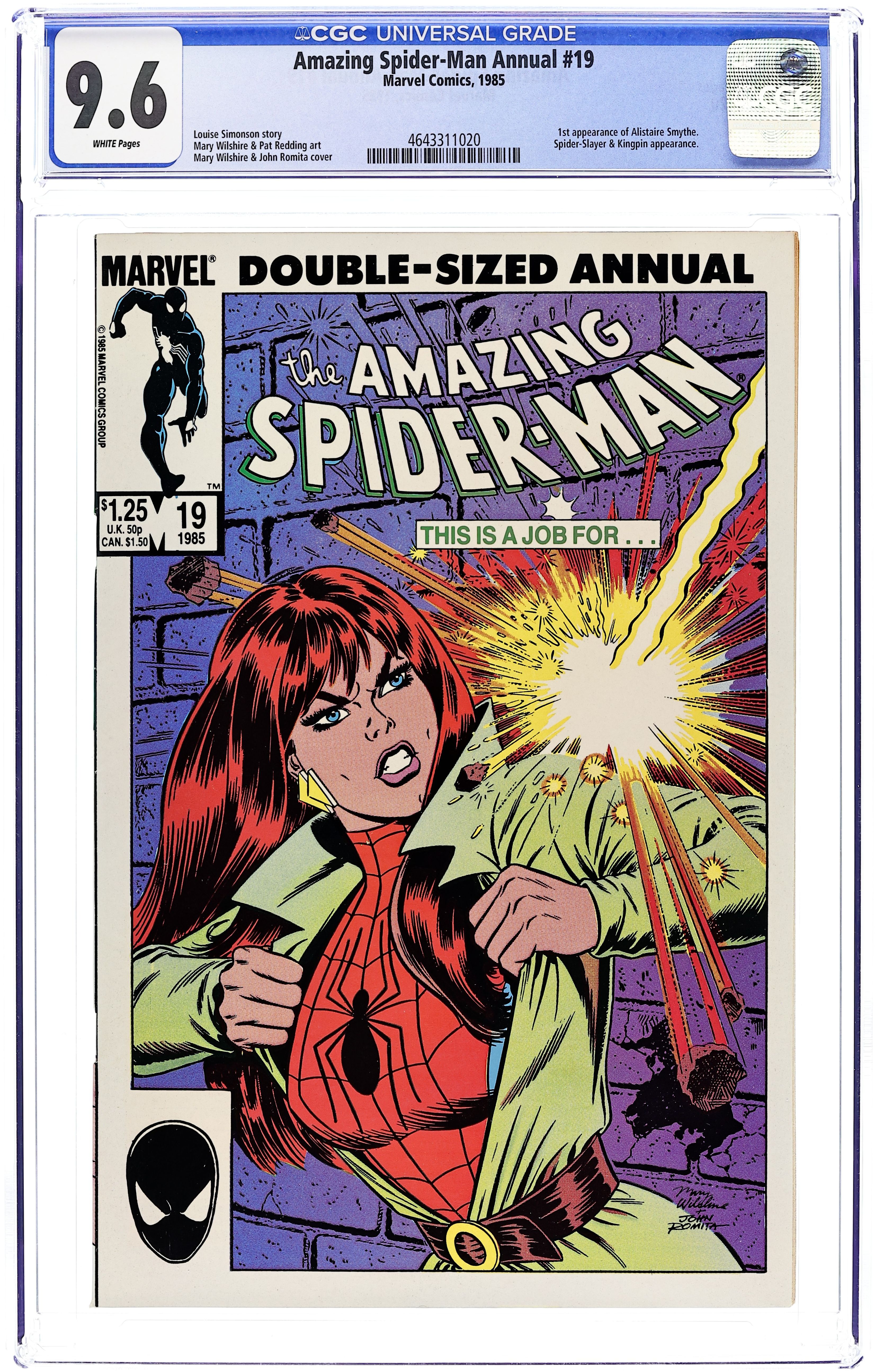 Direct Edition. "Fun 'n' Games" Script by Louise Simonson. Pencils by Mary Wilshire. Inks by Pat Redding. Cover by Mary Wilshire and John Romita, Sr. The son of spider slayer cometh! The genius yet goofy progeny of Professor Spencer Smythe decides it's time to redeem the family name by killing Spider-Man once and for all! And Alistair Smythe begins his scheme by determining that the web-slinger is none other than...Mary Jane Watson! What?! Strange but true! The eccentric madman captures Mary Jane and her aunt in a Manhattan restaurant and thinks his triumph is complete! Until the one and only wall-crawler arrives on the scene! Does the novice Alistair realize what he's gotten into? Your friendly neighborhood Spider-Man is going to show him how the big boys play! A fun story with a great cover! First appearance of Alistair Smythe. Appearances by the Kingpin, Joe Robertson, J. Jonah Jameson, and Aunt May. (Notes: Elements of the plot from Web of Spider-Man 2 continue in this issue. Alistair returns in Amazing Spider-Man 291 with another spider slayer.) 52 pages. Cover price $1.25. Grade: CGC 9.6 explanation of grade Condition: Used (collectible)