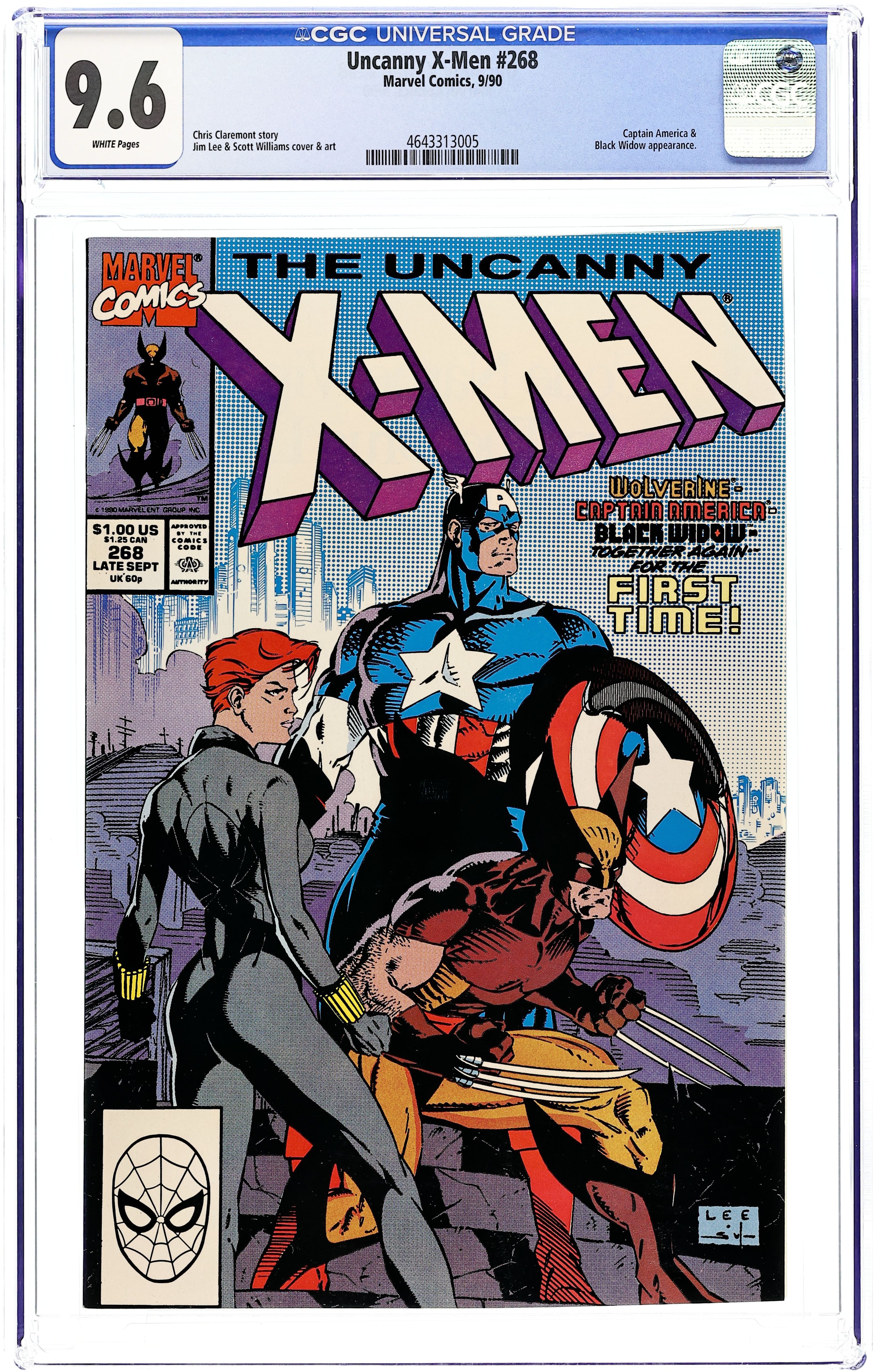 1st Printing. Direct Edition. "Madripoor Knights!" Guest-starring Captain America and Black Widow. Story by Chris Claremont. Art by Jim Lee and Scott Williams. Cover by Jim Lee. In this classic flashback tale, during the second World War, a mysterious man by the name of Logan and a rookie Sentinel of Liberty must team up against the deadly Hand to save the life of a young girl. Meanwhile in the present, Wolverine, Jubilee, Psylocke, and Black Widow finish a caper that began nearly fifty years earlier. NOTE: JC Penney reprint exists with 30th Anniversary Spider-Man in UPC Box. 36 pgs. Cover price $1.00. Grade: CGC 9.6 explanation of grade Condition: Used (collectible)