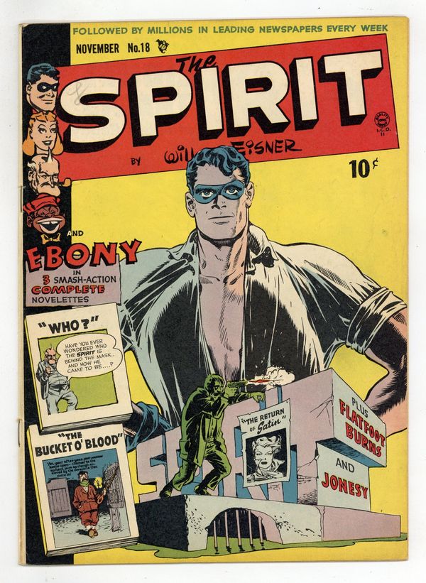 Cover art by Will Eisner. Who starring the Spirit, script by Will Eisner, pencils by Will Eisner and John Spranger, inks by Will Eisner; Spirit's origin retold. The Bucket of Blood starring the Spirit, script by Will Eisner, pencils by Will Eisner and John Spranger, inks by Will Eisner. Satin Returns starring the Spirit, Silk Satin, and Hildie, script and art by Will Eisner. Two Flatfoot Burns stories, scripts and art by Al Stahl. Jonesy humor page by Bernard Dibble. 52 pgs. $0.10. Cover price $0.10. Grade: PR 0.5 explanation of grade Condition: Used (collectible)
