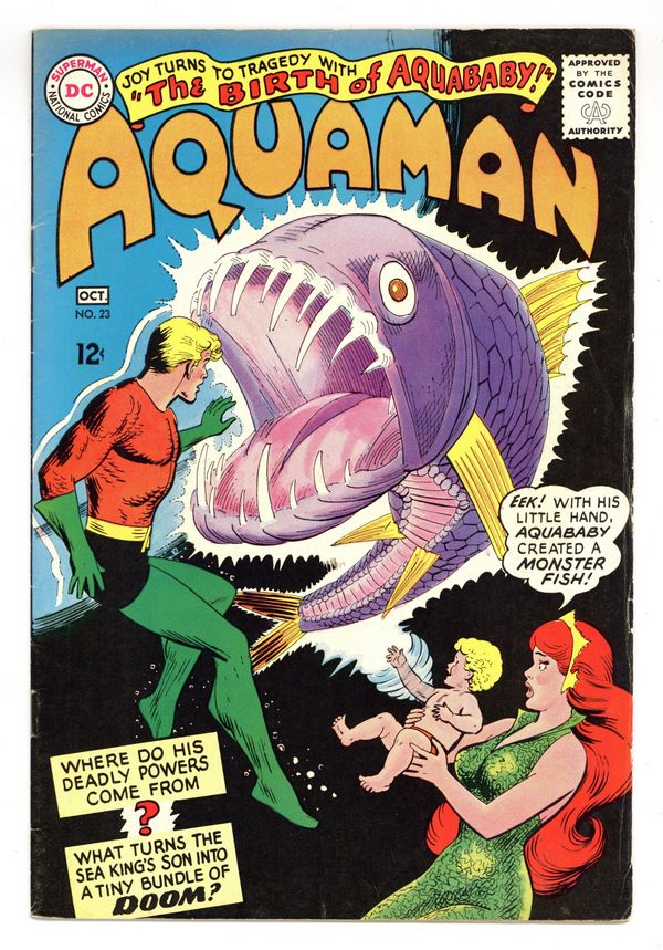 Cover art by Nick Cardy. The Birth of Aquababy, art by Nick Cardy; Mera discovers she's pregnant AND gives birth to Aquababy in the same 1-issue story; Aquaman searches for cure for malady affecting Mera and child; Aquaman gets trapped in volcanic rubble. History on the Rocks article. Little Pete humor half-page by Henry Boltinoff. 36 pgs. $0.12. Cover price $0.12. Grade: VG 4.0 explanation of grade Condition: Used (collectible)
