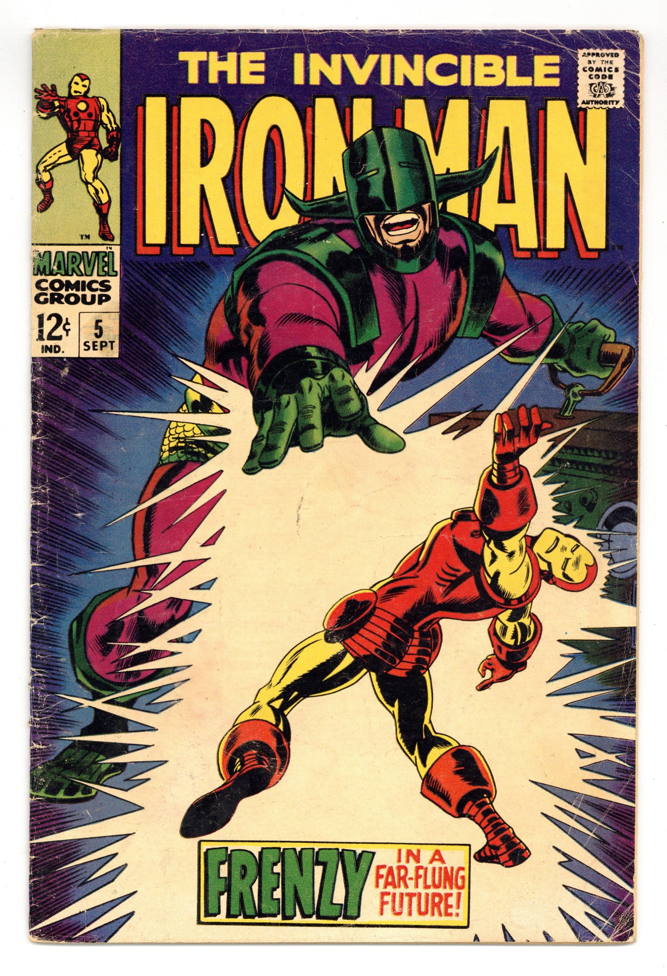 "Frenzy in a Far-Flung Future!" Script by Archie Goodwin. Pencils by George Tuska. Inks by Johnny Craig. Cover by George Tuska. Tony Stark is abducted into the future by warriors from the 24th century, so he can be executed for creating a super computer called Cerebrus back in the 20th century. Cerebrus has evolved 400 years later into a powerful being bent on world domination. Just one problem for Tony...his armor did not make the trip into the future with him! How is the Invincible Iron Man going to triumph this time? 32 pages Cover price $0.12. Grade: GD 2.0 explanation of grade Condition: Used (collectible)