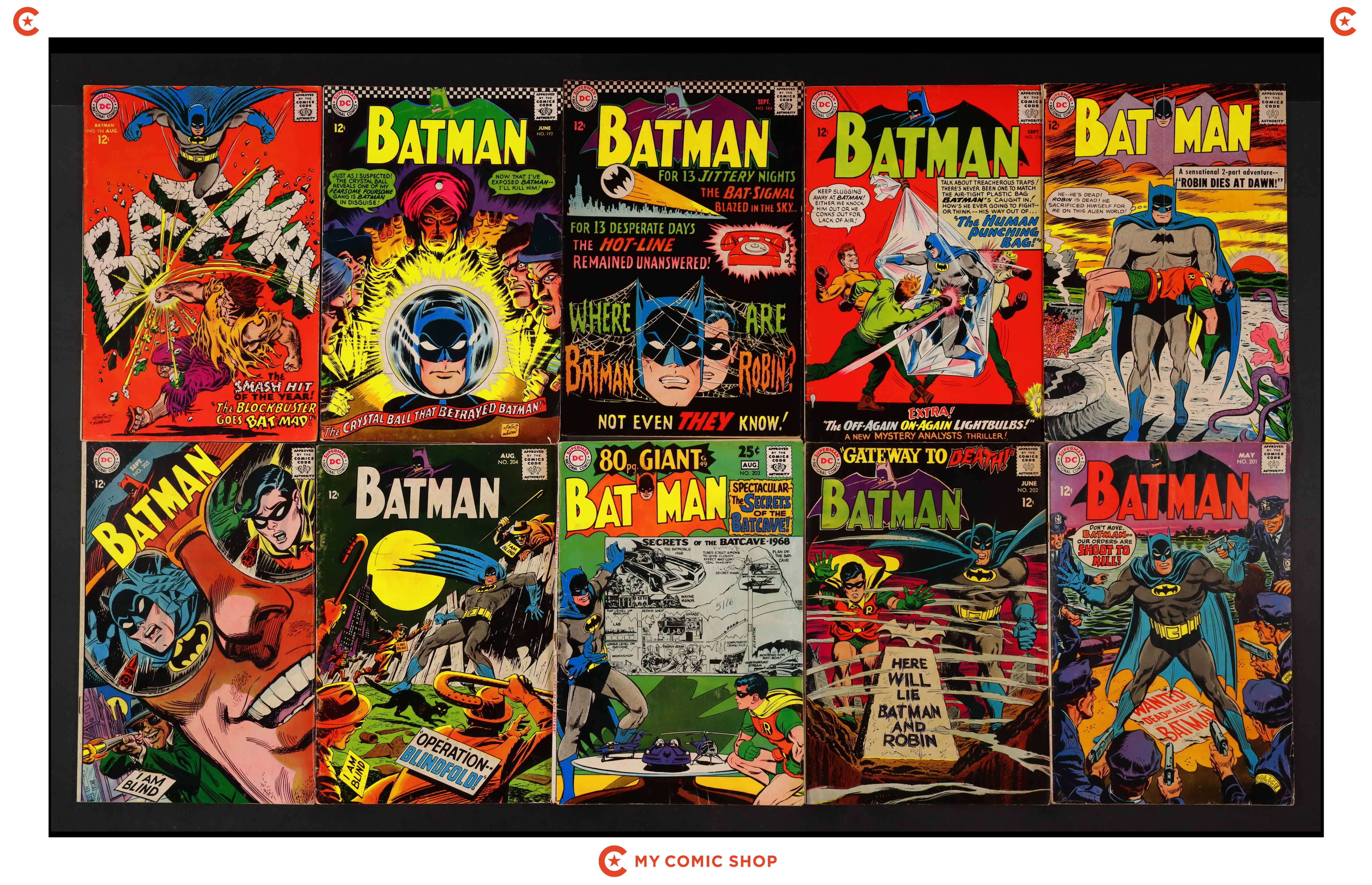 Issues 156, 174, 184, 192, 194, 201-205 of Batman (1940). Most will grade in the GD to VG range.