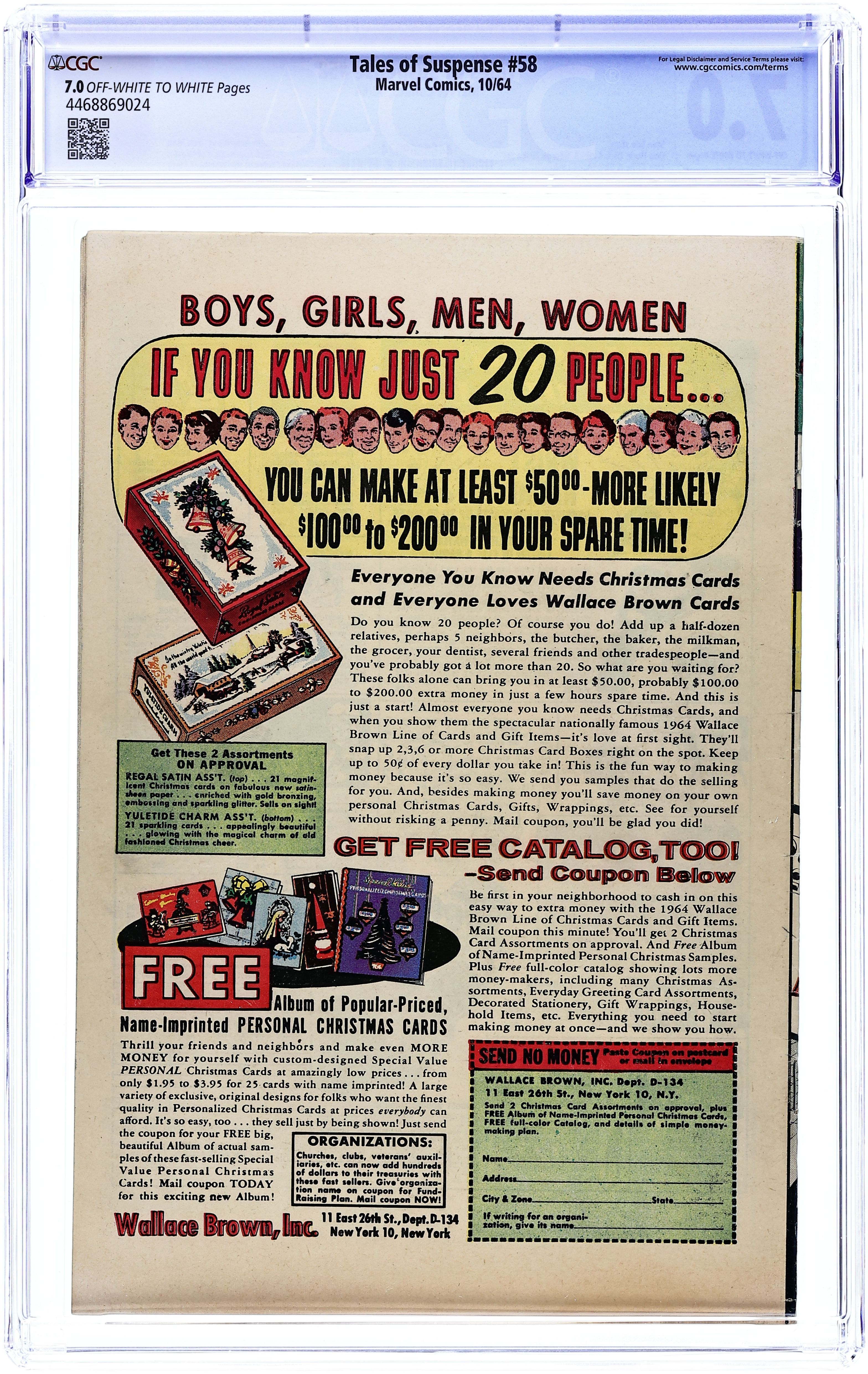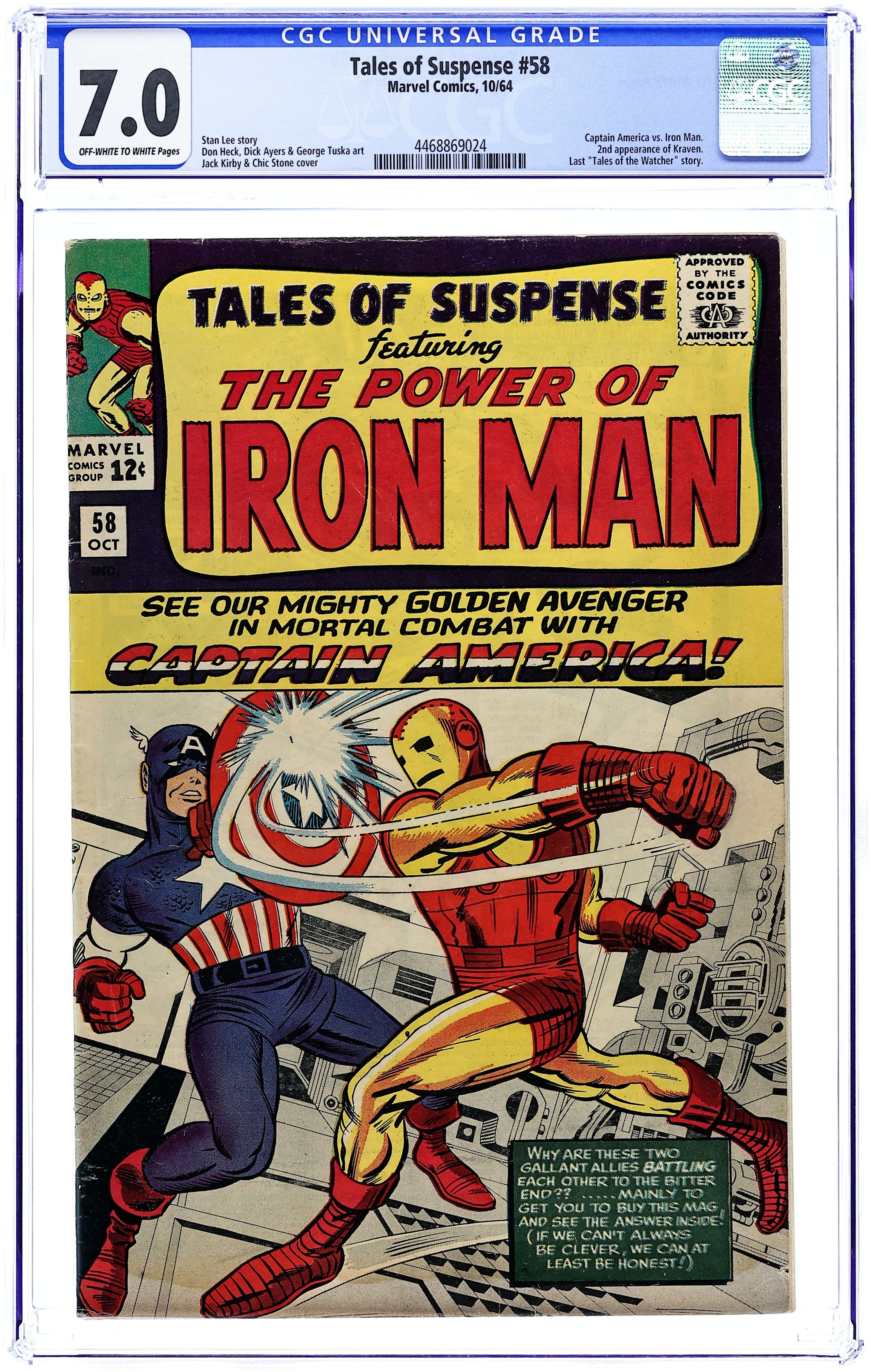 Cover pencils by Jack Kirby, inks by Chic Stone. Captain America (first appearance in this title) battles Iron Man in "In Mortal Combat with Captain America!", script by Stan Lee, pencils by Don Heck and Jack Kirby, inks by Dick Ayers; The Chameleon tricks Iron Man into attacking Captain America, and the two fight until the misunderstanding is discovered; Second Kraven the Hunter appearance; Giant-Man and Wasp appearances. "The Runner!" text story. "The Watcher Must Die!", script by Stan Lee, art by George Tuska; An alien warlord attacks the Watcher, and is instantly destroyed by accelerated aging; This is the last Tales of the Watcher story in Tales of Suspense; Another series starts as a back-up in Silver Surfer (1968 series) #1. 36 pgs., full color. $0.12. Cover price $0.12. Grade: CGC 7.0 explanation of grade Condition: Used (collectible)