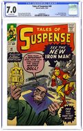 Cover pencils by Jack Kirby, inks by Sol Brodsky. Iron Man gets a snazzy new costume in "The Mysterious Mr. Doll!", script by Stan Lee, pencils by Steve Ditko, inks by Dick Ayers; Mister Doll uses magic dolls to take over whole companies; Iron Man stops him with the help of a new suit of armor. "The Pact," art by Joe Maneely; An historian writing about the trial and execution of his ancestor for witchcraft interviews the only remaining party concerned in the case: the Devil. "Kraddak," script by Stan Lee (plot) and Larry Lieber (script), pencils by Larry Lieber, inks by George Roussos (as G. Bell); An alien tells a greedy mine owner that he will be killed in a fall; The mine owner hides at the lowest possible point in his mine. 36 pgs., full color. $0.12. Cover price $0.12. Grade: CGC 7.0 explanation of grade Condition: Used (collectible)