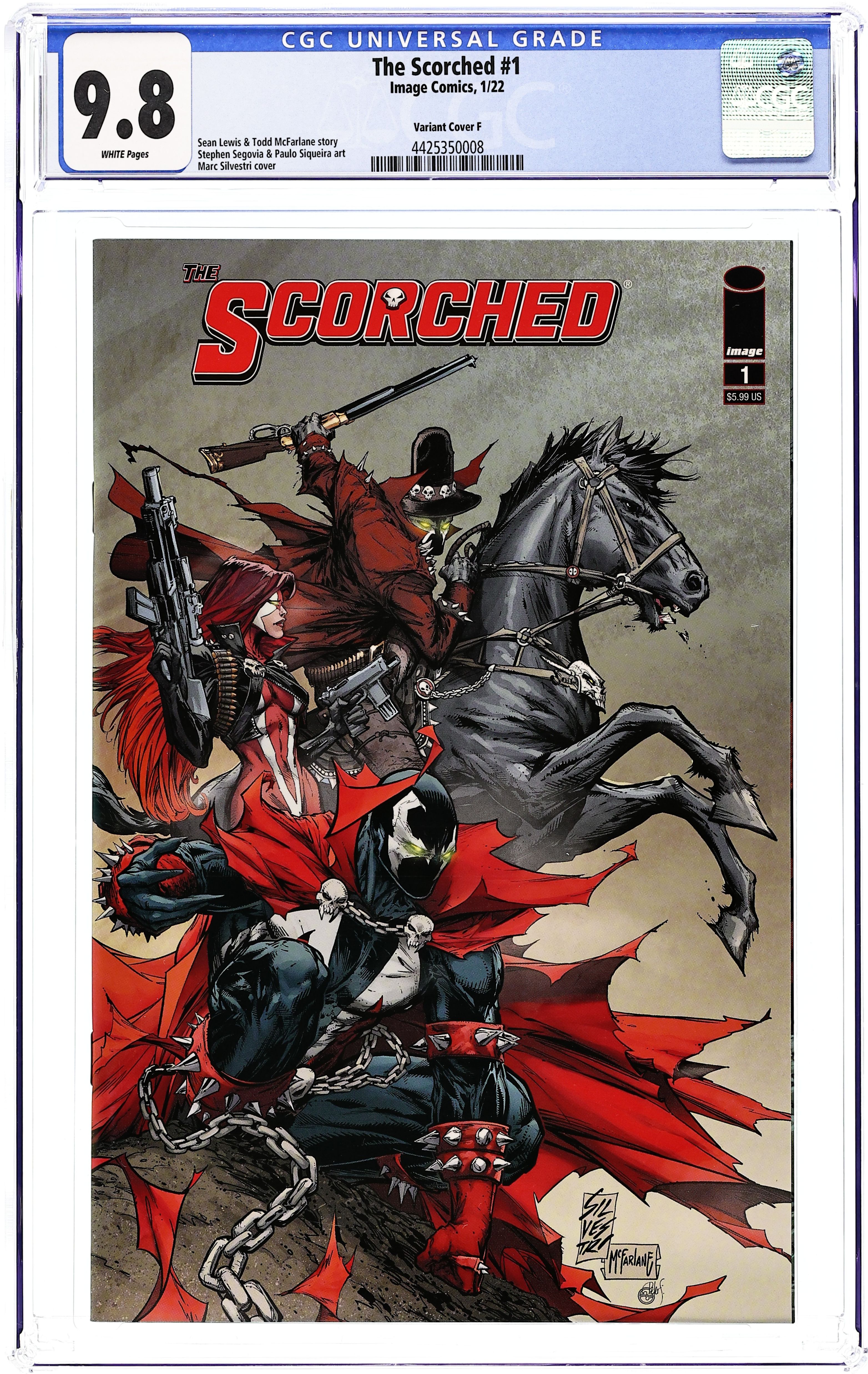 Starts Jan 3 Written by Sean Lewis. Art by Stephen Segovia and Paulo Siqueira. Cover by Marc Silvestri. The first ALL-NEW issue of TODD McFARLANE's superhero team book! There's a threat so big that no single hero can stop it, and the formation of this new supergroup is the only thing standing in its way. Members will include SPAWN, REDEEMER, GUNSLINGER, MEDIEVAL SPAWN, and SHE-SPAWN, with many more heroes waiting in the wings! Join the battle in this FIRST ISSUE extravaganza as the forces of heaven, hell, and earth collide! REGISTER PITCH: An Avengers-esque ensemble of superheroes and the latest entry in SPAWN'S UNIVERSE. Hook readers of KING SPAWN and GUNSLINGER SPAWN, as well as longtime SPAWN fans. 48 pages, full color. Cover price $5.99. Grade: CGC 9.8 explanation of grade Condition: Used (collectible)