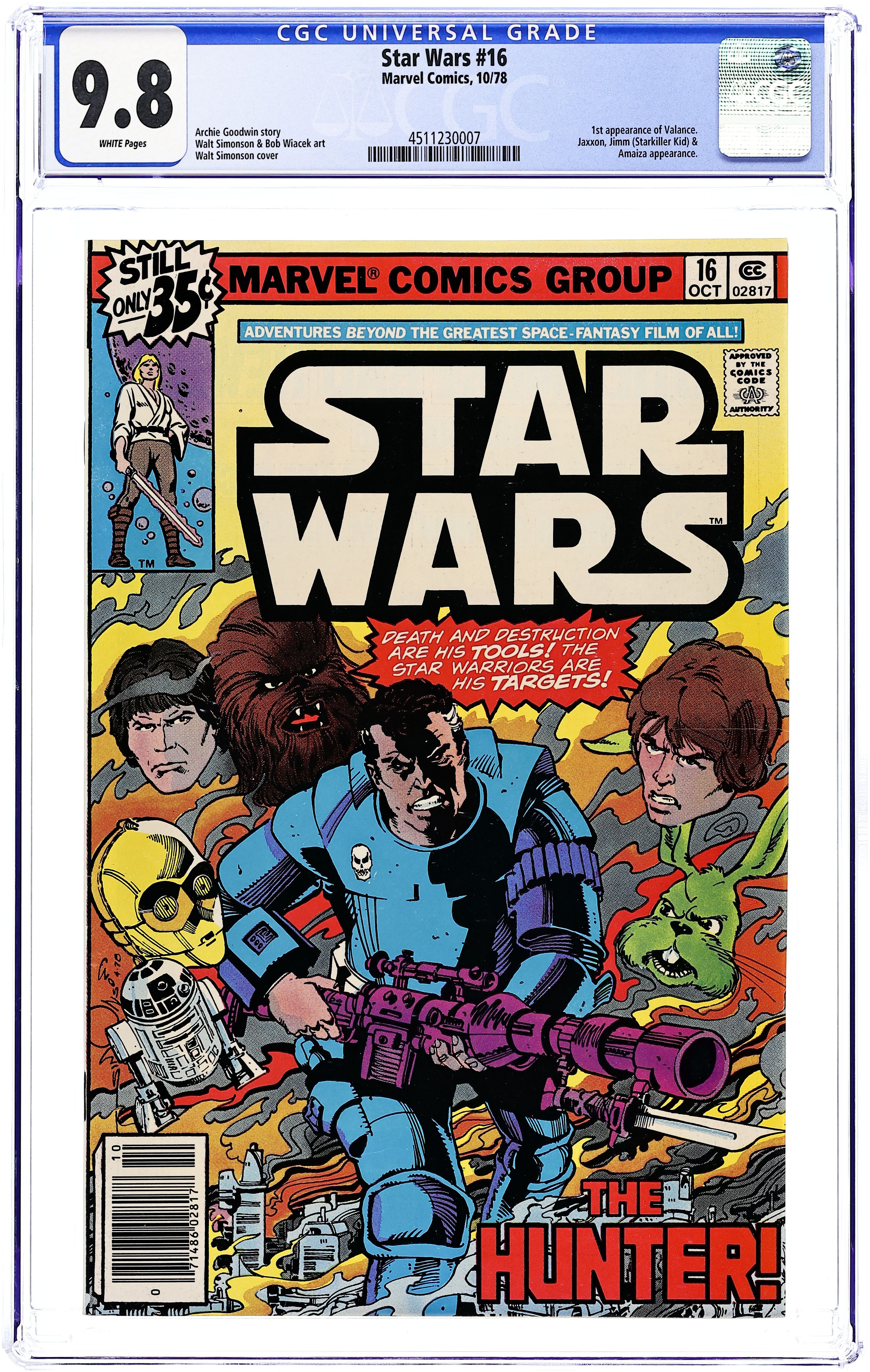"The Hunter!" Written by Archie Goodwin. Art and cover by Walt Simonson and Bob Wiacek. Luke, Han, and the other heroes of Star Wars have just been targeted by one of the deadliest bounty-hunters in the galaxy - Valance the Hunter. What is this assassin's secret that makes him so dangerous? The answer may shock you. Cover price $0.35. Grade: CGC 9.8 explanation of grade Condition: Used (collectible)