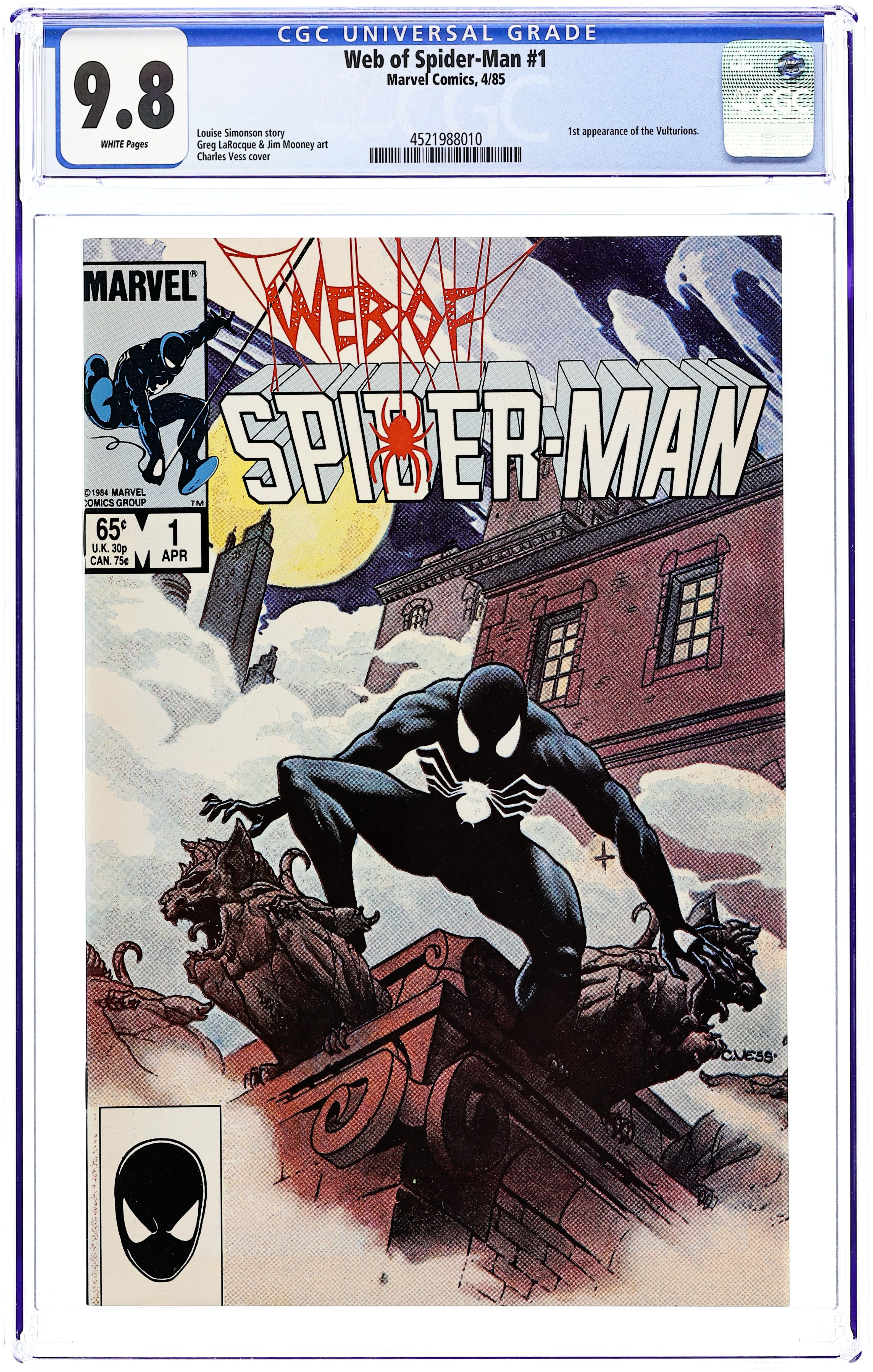 Direct Edition. "Til Death Do Us Part!" Story by Louise Simonson. Art by Greg LaRocque and Jim Mooney. Painted cover by Charles Vess. The alien symbiote (aka black costume) ambushes Peter Parker while he is getting dressed. Now Spider-Man must battle the black costume and the new Vulturions on his way to the Baxter Building! Meanwhile, Aunt May laments Peter's decision to drop out of graduate school. (Note: The Web of Spiderman series essentially replaced the Marvel Team-Up title as Marvel's third regular series featuring Spider-Man.) 32 pages Cover price $0.65. Grade: CGC 9.8 explanation of grade Condition: Used (collectible)