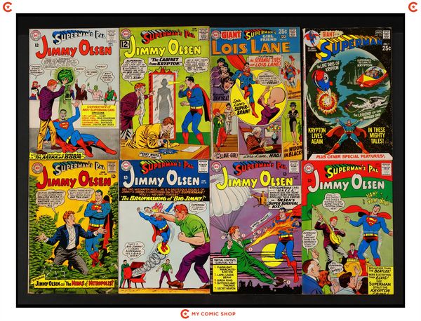 Issue 232 of Superman (1939 1st Series), issue 95 of Superman's Girlfriend Lois Lane (1958), and issues 66, 87, 88, 89, 90, 108 of Superman's Pal Jimmy Olsen (1954). most will grade in the GD to FG range with #87 grading FN.