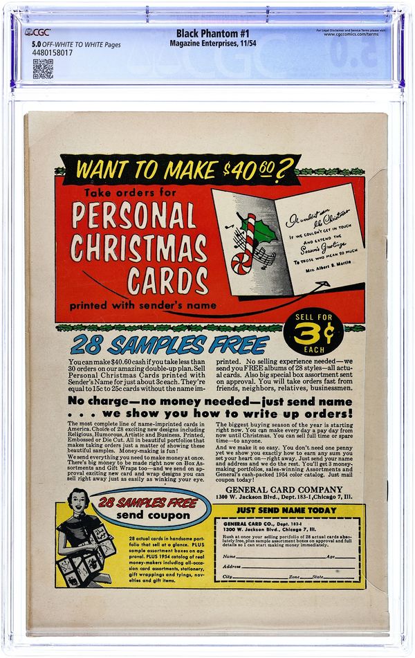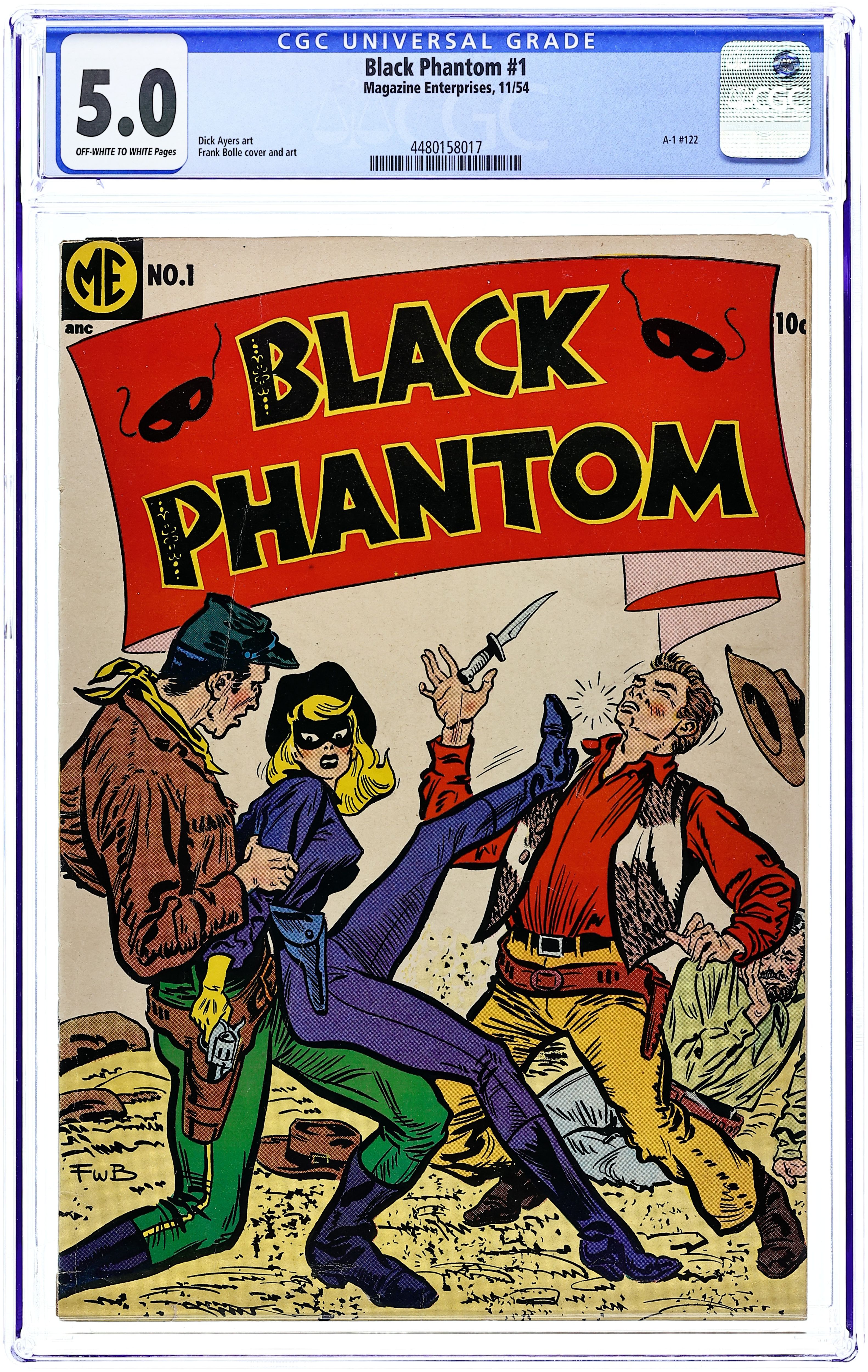 Stories by Gardner Fox. Art by Frank Bolle and Dick Ayers. Cover by Frank Bolle. Sometimes listed as A1 Comics (1944 Life's Romances) #122. A solo effort starring bad girl Black Phantom, formerly an adversary of Western hero Redmask, who has turned to fighting outlaws on her own. Black Phantom takes on the trio of outlaws who ride into town with their eyes on the bank; BP must figure out why someone is stealing what appears to be useless junk; Sheriff Satan of the outlaw town of Helldorado puts lawmen in jail and outlaws in power, until the Black Phantom comes along. Featuring early stories by future comics legend Gardner Fox. The Unholy Three!; The Nothing Robber!; Sheriff Satan!; The Ghost Rider. 36 pages, Full Color. Cover price $2.10. Grade: CGC 5.0 explanation of grade Condition: Used (collectible)