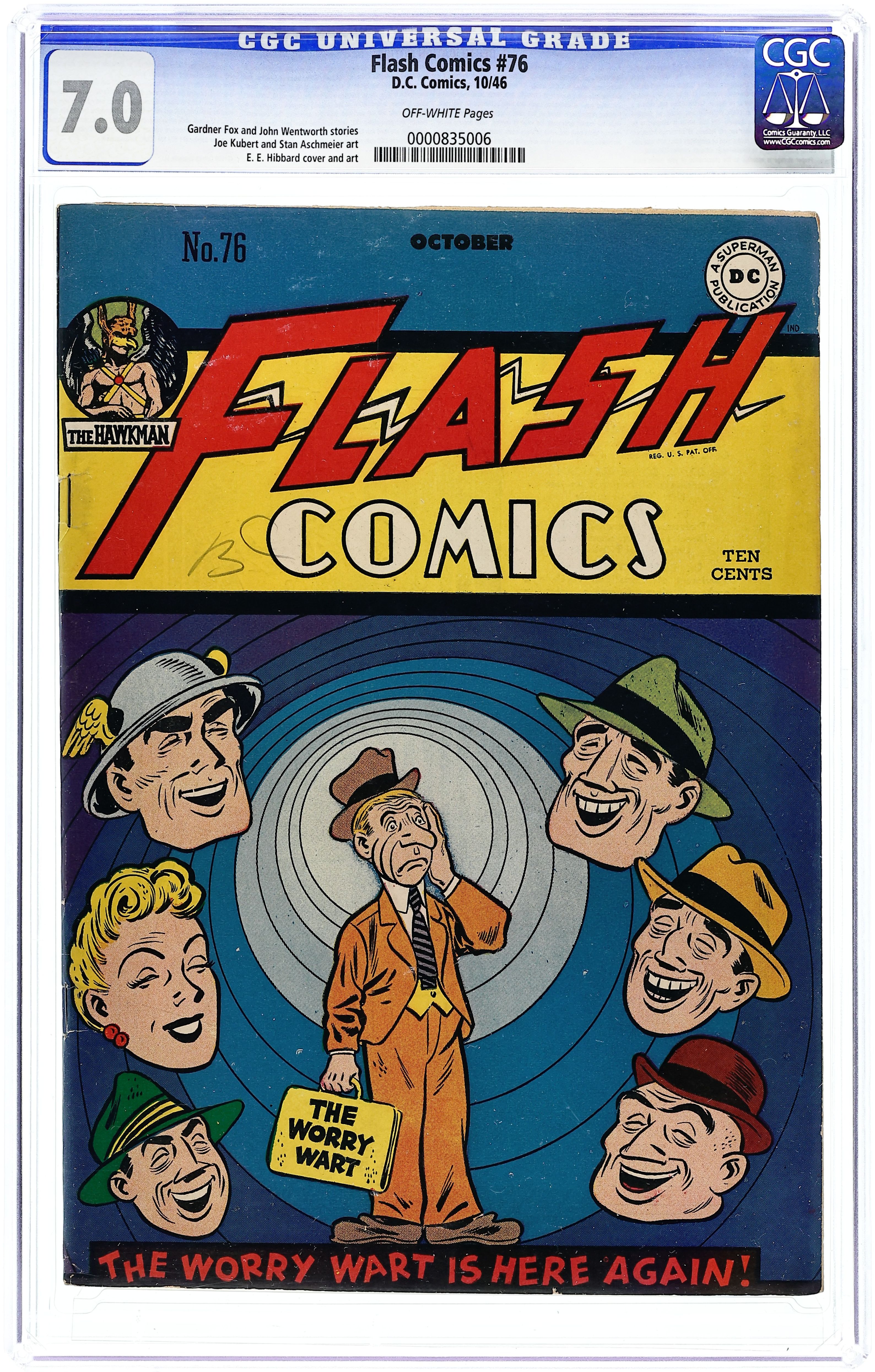 Flash stars in "The City That Couldn't Stop Laughing," written by Gardner Fox, art by Everett E. Hibbard. Also includes: a Ghost Patrol story by John B. Wentworth and Frank Harry; Johnny Thunder in "The Dog Bandits" by John B. Wentworth and Stan Aschmeier; a Rockhead McWizzard story by Jack Farr; Out of the Gag Bag by Ed Wheelan; Ton o' Fun by Harry Lampert; and Hawkman in "The Crazy Quilt Crimes" by Fox and Joe Kubert. Cover art by Hibbard. 52 Pages, Full Color. Cover price $0.10. Grade: CGC 7.0 explanation of grade Condition: Used (collectible)