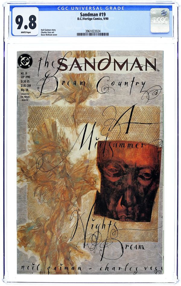 Dream Country, Part 3 of 4: "A Midsummer Night's Dream." There's no business like show business as the Sandman gets a performance, Mr. Shakespeare gets stage fright, and Bottom gets an ass's head. Written by Neil Gaiman, with art by Charles Vess. Painted cover by Dave McKean. Suggested for Mature Readers. New Format. Cover price $1.50. Grade: CGC 9.8 explanation of grade Condition: Used (collectible)