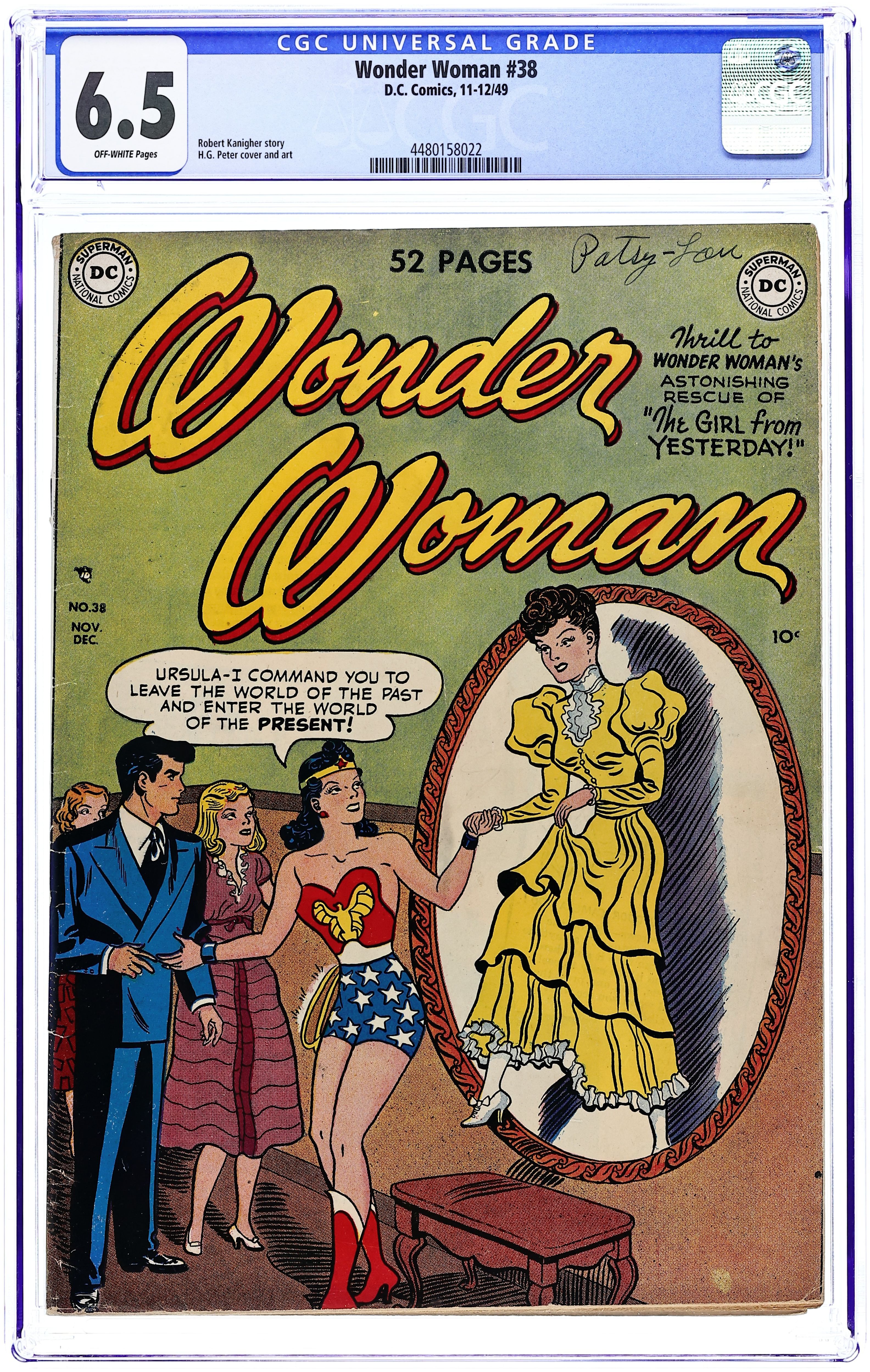 Cover by Harry G. Peter. "The Girl from Yesterday," script by Robert Kanigher, art by Harry G. Peter; Wonder Woman gets involved with a woman whose aunt has kept her living in the past. "Wonder Woman Captures the Moon," script by Robert Kanigher, art by Harry G. Peter. Wonder Women of History: three-page Hannah Moore bio by Julius Schwartz, pencils by Arthur F. Peddy, inks by Bernard Sachs. Two-page article, "Music Makers." "The Five Tasks of Thomas Tighe," script by Robert Kanigher, art by Harry G. Peter; Wonder Woman must help the Holliday Girls succeed at five tasks where men have failed in order to secure a million dollars for the Holliday College scholarship fund from a misogynist. One-page Tootsie Roll ad, "Captain Tootsie Saves the Day," art by C.C. Beck. 52 Pages, Full Color. Cover price $0.10. Grade: CGC 6.5 explanation of grade Condition: Used (collectible)