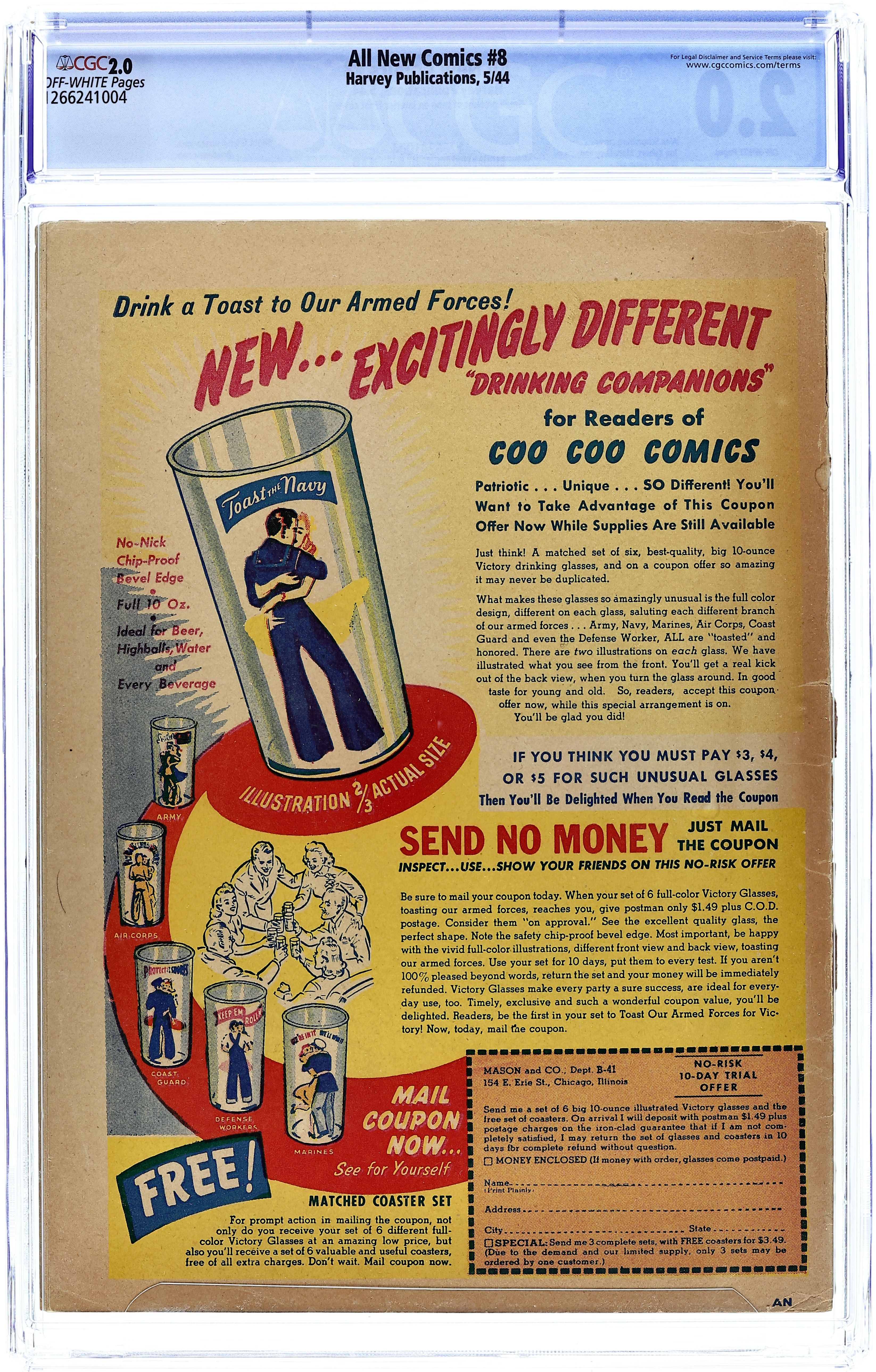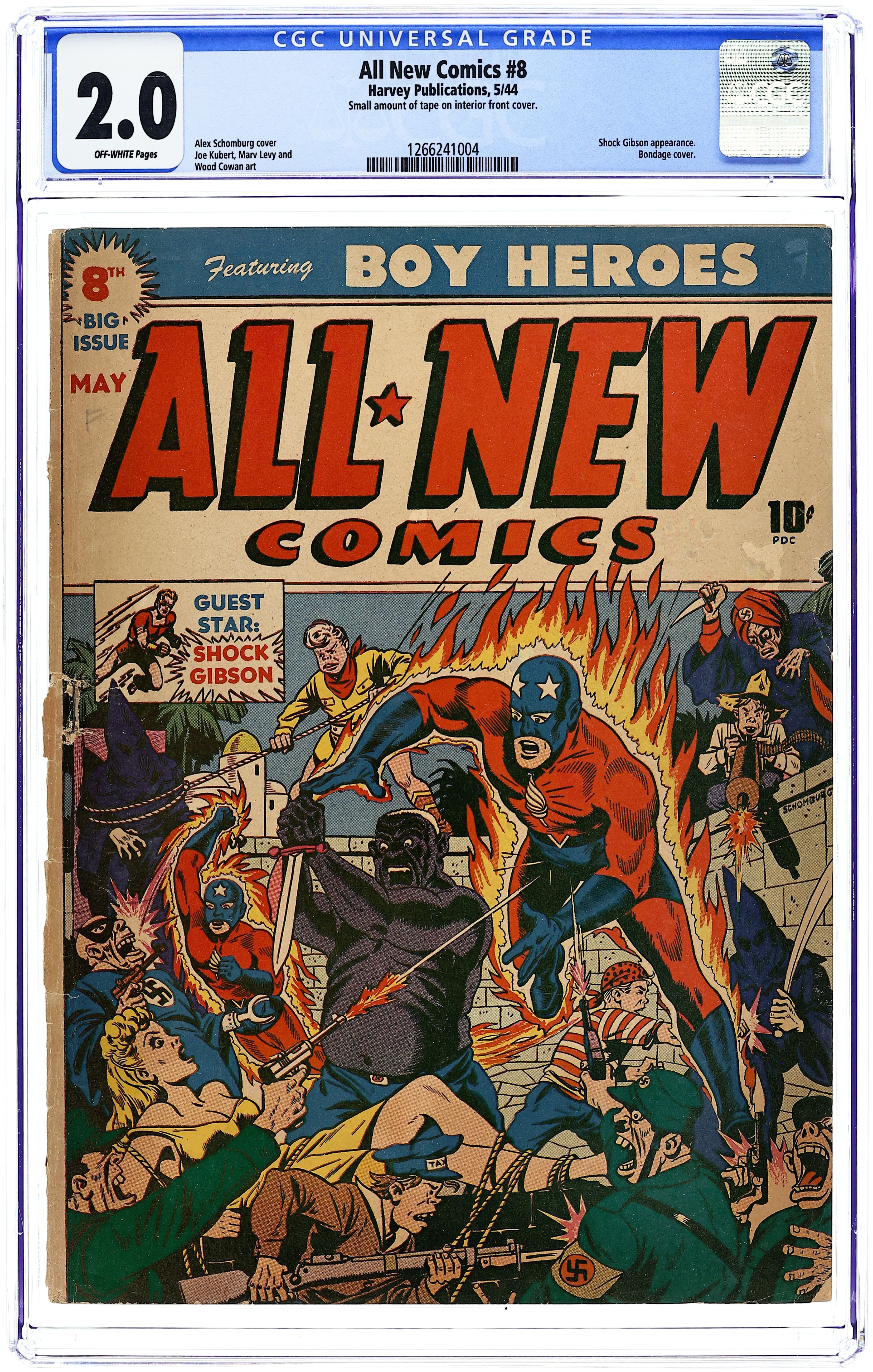 Cover by Alex Schomburg. Stories by unknown. Art by unknown. In this issue: Boy Heroes in "Fortunes for Four"; Blonde Bomber in untitled tale; "Flight of the Flying Angel"; Shock Gibson in "Bergs of Banzai"; "Fury of the Deep"; and Captain Red Blazer and Sparky in 2-page untitled Story Behind the Cover text story. Plus: untitled Corporal Fooie (introduction) 2-pager (with art by Wood Cowan). Also: untitled Five Princesses of Pompadoonk 2-pager (with art by Marv Levy). 48 pages, full color. Cover price $0.10. Grade: CGC 2.0 explanation of grade Condition: Used (collectible)