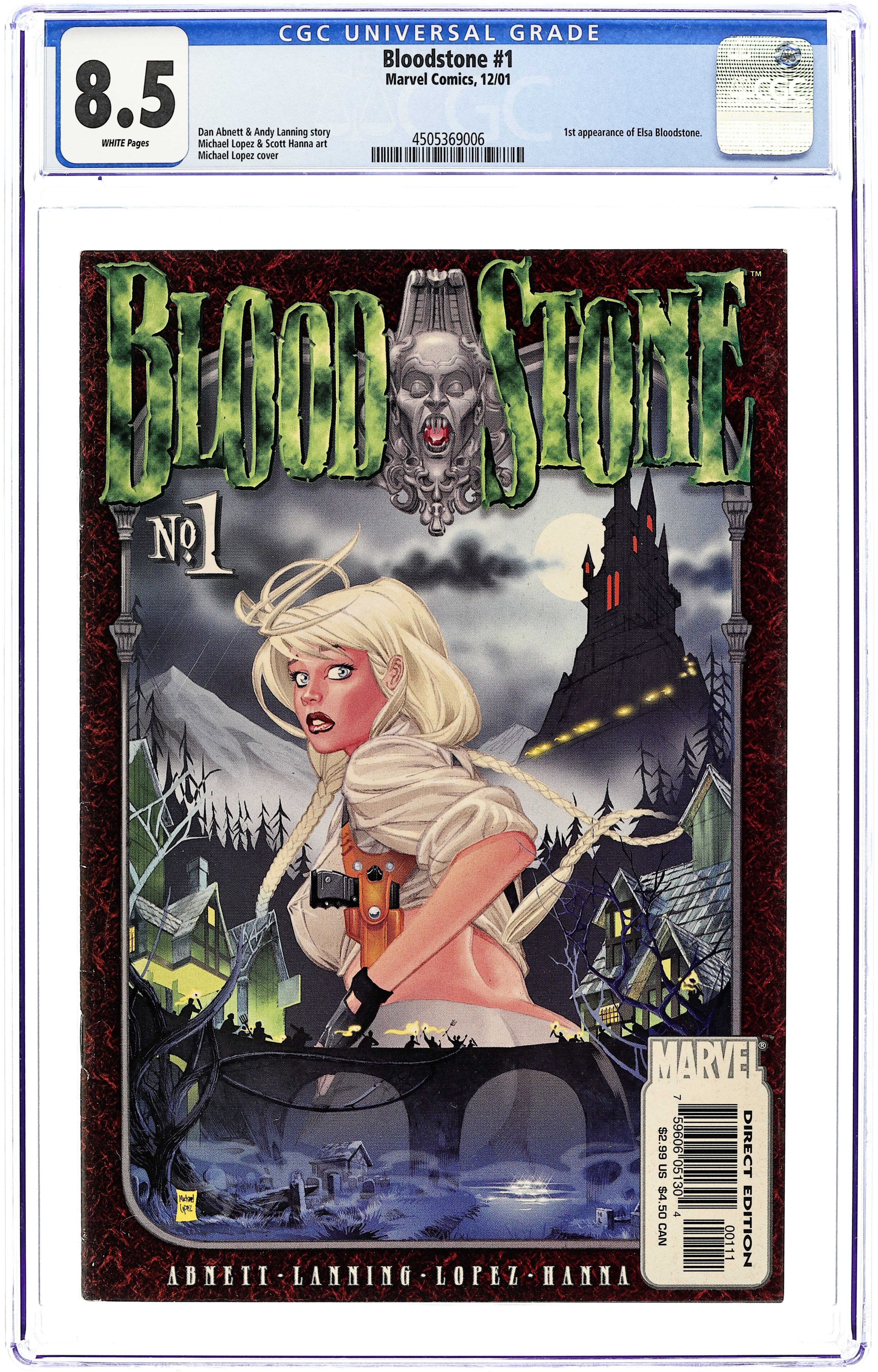 Blood Runs Thicker... - Written by Dan Abnett and Andy Lanning. Art by Michael Lopez and Scott Hanna. Cover by Michael Lopez. 1st appearance of Elsa Bloodstone. Growing up was tough for Elsa. Her mom was a nerdy archaeologist, she was constantly moving from place to place searching for the next ancient wonder, and she never knew anything about her father...until today! What do you do when you discover that your dad was the legendary monster hunter, Ulysses Bloodstone...and that he died doing what he loved best? You take up the mantle and kick some major monster butt...without your mom finding out, of course! Fans of Indiana Jones, Lara Croft or Buffy will definitely dig the hot hero called Bloodstone! With Dan Abnett and Andy Lanning providing the never-rest-for-a-moment story, and beautiful artwork by Michael Lopez and Scott Hanna, this adventure will be a light-hearted romp through the world of horror and the supernatural! And character design help from Alex Ross never hurts! 32 pages, full color. Cover price $2.99. Grade: CGC 8.5 explanation of grade Condition: Used (collectible)