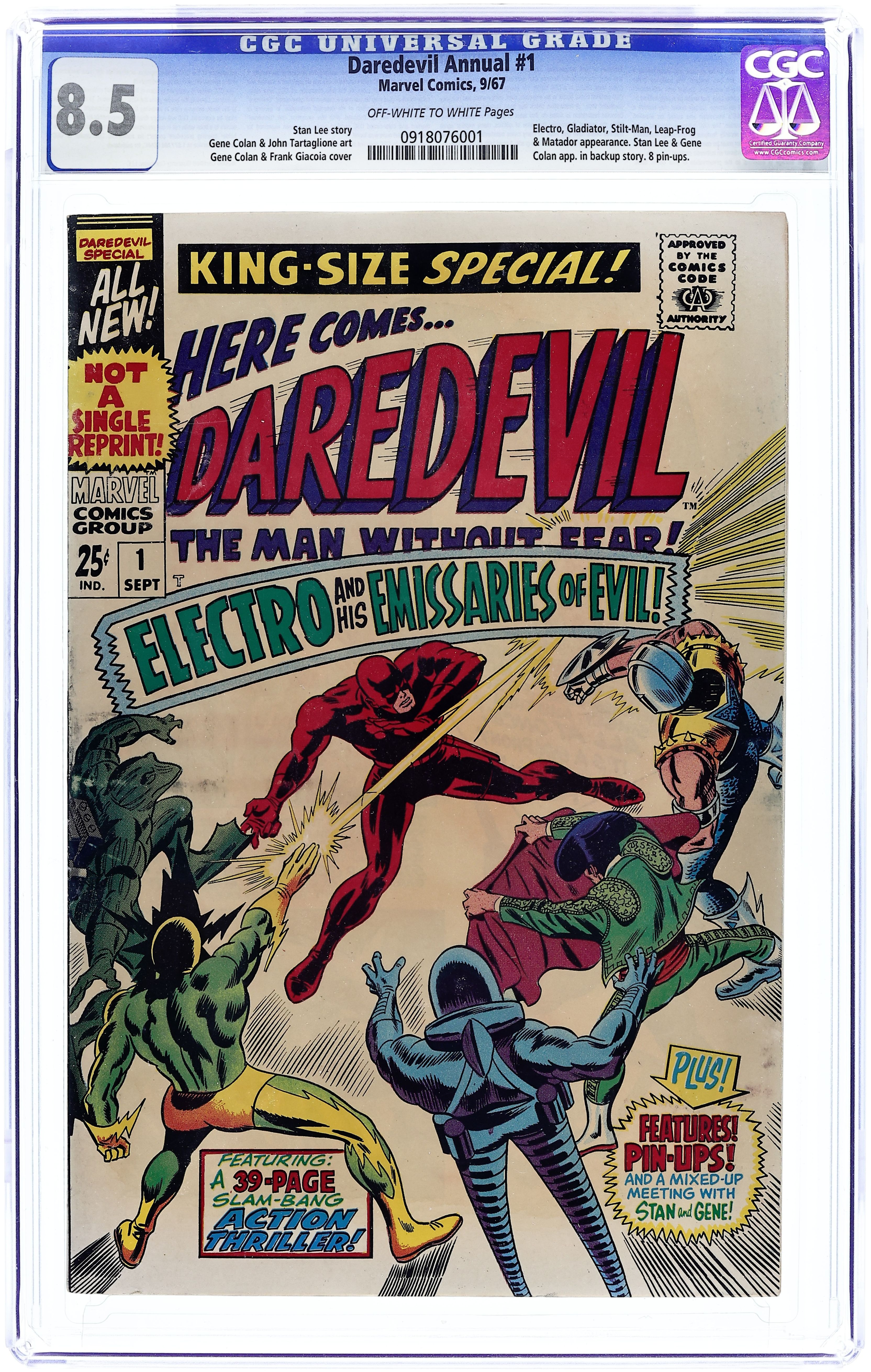 64-page all-new giant-size issue (no reprints). "Electro and the Emmisaries of Evil!" Script by Stan Lee, pencils by Gene Colan, inks by John Tartaglione. Back-up features inclue "Inside Daredevil" (2 pages of "far-out facts"), "An Explanation" (two pages about Mike Murdock), "Blueprint for an All-Purpose Billy Club" (one page), "At the Stroke of Midnight" (three pages showing Lee and Colan in a story conference), and pin-ups of Karen Page, Foggy Nelson, Ka-Zar, Daredevil, the Gladiator, the Leap-Frog, the Owl, and the Masked Marauder.. Colan/Frank Giacoia cover. Cover price $0.25. Grade: CGC 8.5 explanation of grade Condition: Used (collectible)