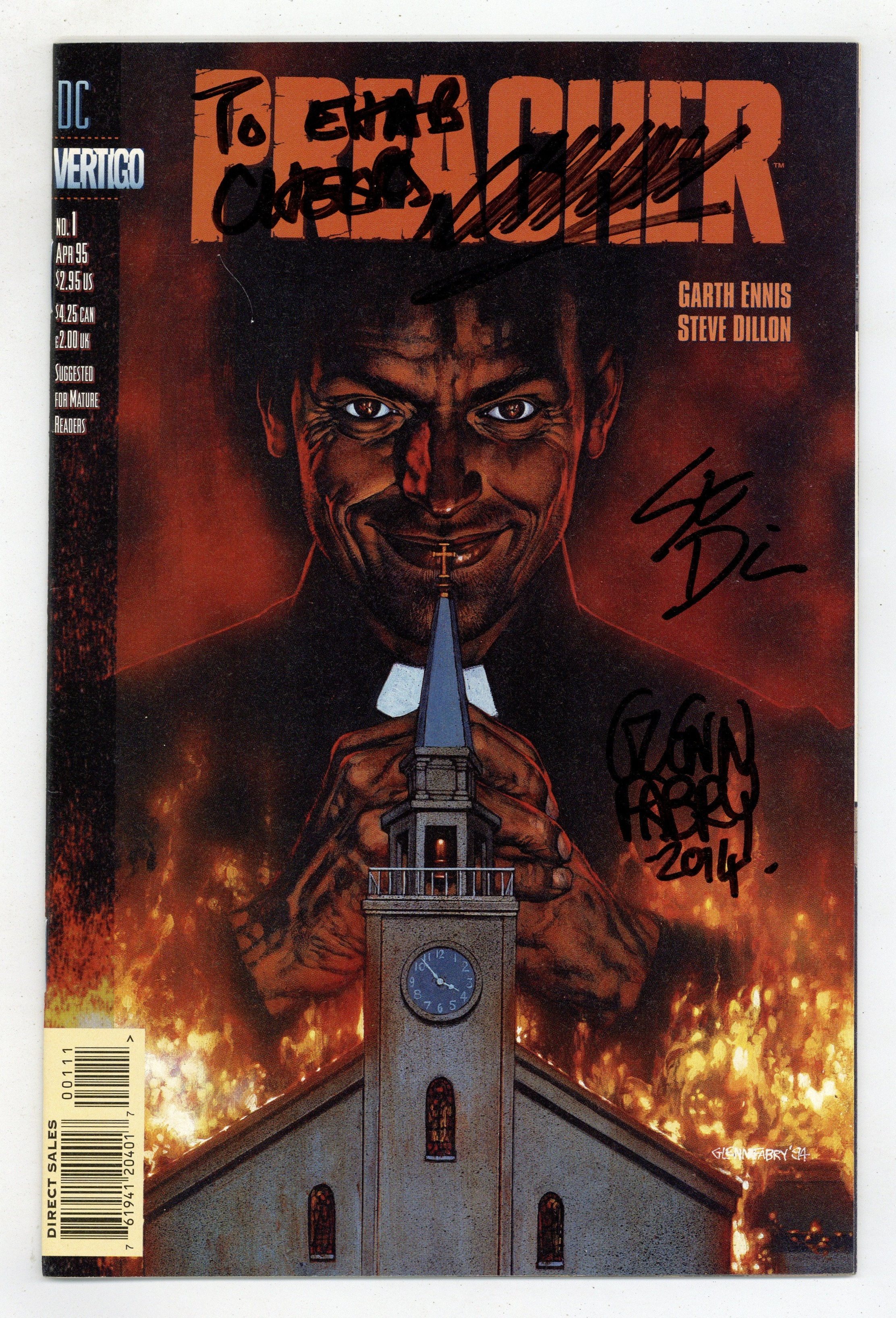 Signed by Garth Ennis (personalized), Steve Dillon, and Glenn Fabry. No certification is included.
