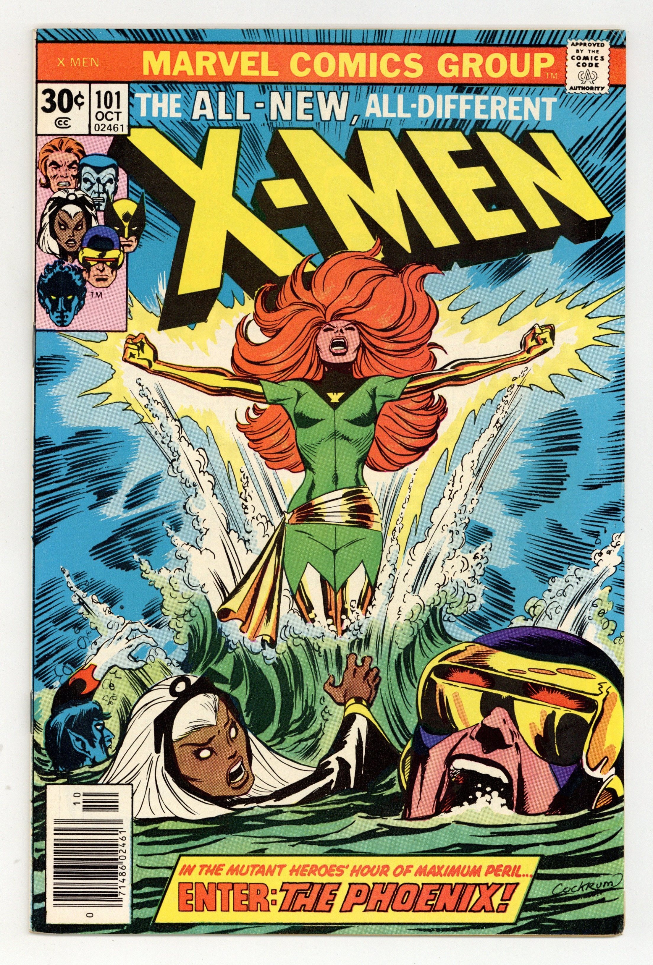 "Like a Phoenix, from the Ashes!" Part 1 of 3. Story by Chris Claremont. Art by Dave Cockrum and Frank Chiaramonte. In the startling aftermath of last issue's events, the X-Men crash-land back on Earth, but they soon learn that a unbelievable change has come over Jean Grey. Don't miss the rise of the Phoenix! Meanwhile, the team decides to take in some much needed R&R. They head to Ireland to Banshee's ancestral home. However, nothing but danger and death wait for them here. 36 pages, full color. NOTE: 1st appearance of Phoenix, 1st appearance of Black Tom Cassidy, and Juggernaut cameo. Cover price $0.30. Grade: FN/VF 7.0 explanation of grade Condition: Used (collectible)