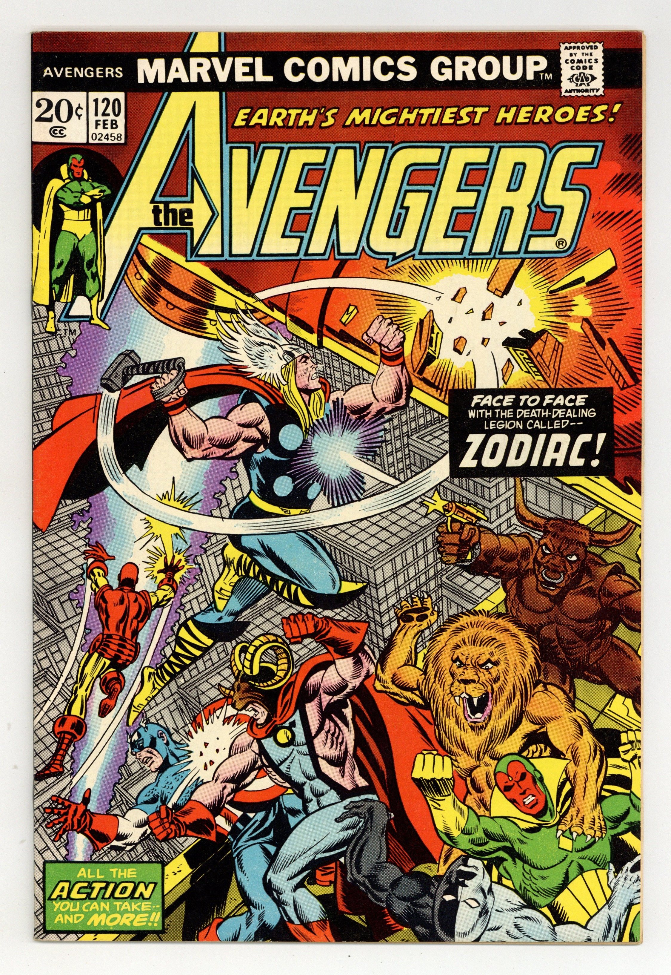 Starts Dec 15 "Death-Stars of the Zodiac!" Part 1 of 3. Script by Steve Englehart. Pencils by Bob Brown. Inks by Don Heck. Cover by Jim Starlin and Frank Giacoia. As shown on Jim Starlin's spectacular cover, the Zodiac attacks! Taurus (aka Cornelius Van Lunt) has reformed the 12-member cartel for one express purpose! Destroying the Avengers! In brazen fashion, the super-villains from the stars storm into Avengers Mansion and overwhelm the five avengers inside! After licking their wounds, Earth's Mightiest Heroes discover that Taurus has another diabolical objective on his agenda! Kill every person in Manhattan born under the sign of Gemini! Wow, where did the Zodiac get that kind of power? It doesn't matter now as Taurus' giant star-blaster is set to fire its death-ray from atop the World Trade Center! It's a frantic race against time to save thousands of Gemini! Avengers Assemble! Avengers Lineup: Iron Man, Mantis, Scarlet Witch, Swordsman, Thor, and the Vision. (Note: Captain America is depicted on the cover but does not appear in the story inside.) 36 pages Cover price $0.20. Grade: VF 8.0 explanation of grade Condition: Used (collectible)