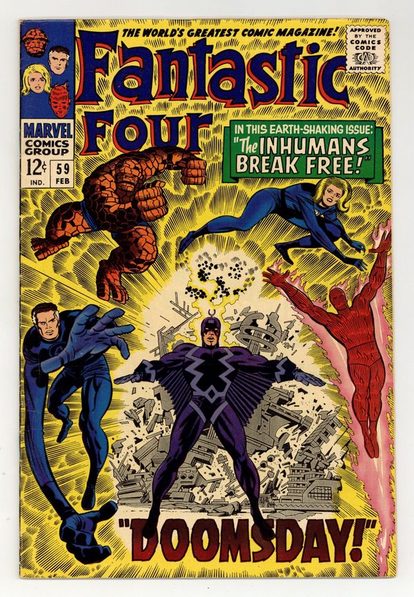 Cover pencils by Jack Kirby, inks by Joe Sinnott. Doctor Doom steals the Silver Surfer's cosmic powers (part 3 of 4) in Doomsday, script by Stan Lee and Jack Kirby (co-plot), pencils by Jack Kirby, inks by Joe Sinnott; Dr. Doom wreaks havoc across the globe with the Power Cosmic; Black Bolt destroys the barrier that was imprisoning the Inhumans. Brief Inhumans appearance. 36 pgs. $0.12. Cover price $0.12. Grade: VG/FN 5.0 explanation of grade Condition: Used (collectible)