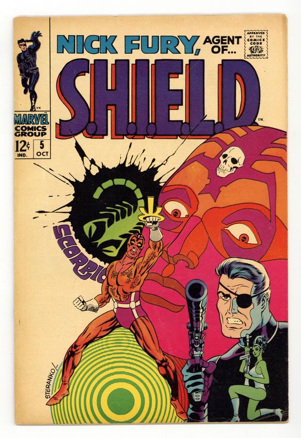 Starts Dec 15 Cover by Jim Steranko. "What Ever Happened To Scorpio?", script by Jim Steranko, pencils by Jim Steranko, inks by John Tartaglione; Val reads Nick's horoscope in the morning paper, which says "Someone in your past will return today"; Nick pays a visit on Pickman, who's helping him locate someone, and he doesn't want SHIELD involved; The ESP Division picks up "possible danger", sending Nick to a seemingly-deserted warehouse - and straight into a trap set by Scorpio!; Nick's Farrari is destroyed, and Nick is captured; While unconscious, Scorpio creates a face-mask to allow him to impersonate Nick, then goes in disguise to view the test of the latest model of LMD; But as it begins, no one else realizes the robot has been replaced with Nick, drugged so he can't speak!; Miraculously, Fury manages to dodge one death trap after another, then faces his would-be killer; Val, trying to save Nick's life, shoots at the "LMD" - but hits Pickman instead, who found his way in via a secret passage. Letters to the editor from comics writer Don McGregor and fanzine publisher Ronn Foss. 36 pgs., full color. $0.12. Cover price $0.12. Grade: VG 4.0 explanation of grade Condition: Used (collectible)