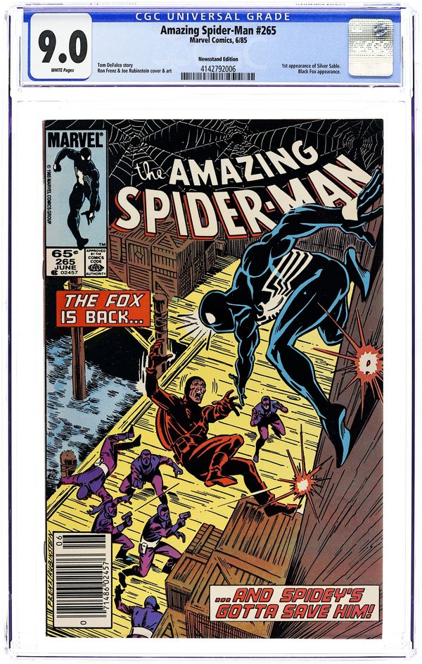 Starts Dec 8 First printing. Newsstand Edition. First appearance of Silver Sable. Script by Tom DeFalco. Pencils by Ron Frenz. Inks by Joe Rubinstein. Cover by Ron Frenz and Joe Rubinstein. "After the Fox!". The Black Fox is on the run! But it's not the Spectacular Spider-Man who's chasing him! It's Silver Sable! An adventurer for hire from the European country of Symkaria! Silver Sable and her Wild Pack pursue the fox through the streets of Manhattan and then later corner him on the waterfront! However, the aging international jewel thief has a wall-crawling guardian angel! Down on the docks, the sparks fly as the web-slinger gives Silver Sable a lesson in diplomacy...superhero-style! Second appearance of the Black Fox. Cameo appearances by Aunt May, Mary Jane Watson, Harry Osborn, Liz Osborn, and Normie Osborn. (Notes: Silver Sable appears next in Amazing Spider-Man 279. The Black Fox returns in Web of Spider-Man 14. There is a second printing of this issue published in 1992. The second printing features a gray cover and a yellow dog ear touting the first appearance of Silver Sable. This story was also reprinted in Marvel Tales 277.) 36 pgs. Cover price $0.65. Grade: CGC 9.0 explanation of grade Condition: Used (collectible)