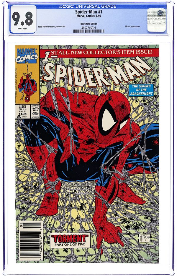 Starts Jan 3 Unbagged Newsstand Edition. Torment: Part 1 of 5. Story, art and cover by Todd McFarlane. Fresh off his legendary run on Amazing Spider-Man, super-star artist Todd McFarlane is given the reigns to his very own Spidey title. Right out of the gate the wall-crawler will be challenged like never before as mysterious and ominous drums in the distance are driving the savage Lizard to cut a swath of death and destruction through the streets of New York City. Can Spider-Man discover the one responsible for this madness before his arch foe causes more damage? NOTE: Webbing on cover may be grey or purple. Cover price $1.75. Grade: CGC 9.8 explanation of grade Condition: Used (collectible)