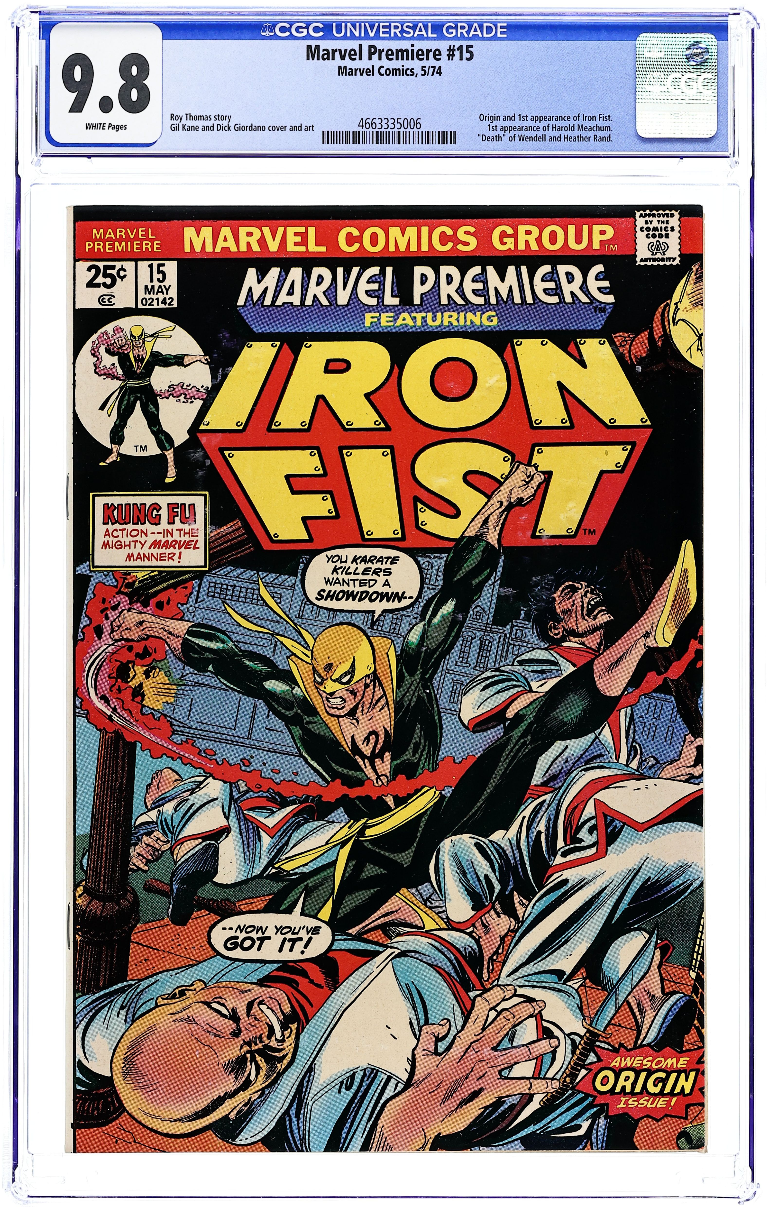 First 25-cent cover price. Origin and first appearance of Iron Fist in The Fury of Iron Fist!, script by Roy Thomas, pencils by Gil Kane, inks by Dick Giordano; Iron Fist passes the final tests in his K'un-Lun training and is granted the privilege of immortality if he so chooses; During his final battle with the robot Shu-Hu, Danny remembers how his father was killed by Meachum and his mother gave her life to save his as the Rand family searched for the fabled city of K'un-Lun. The letters page contains Marvel Value Stamp series A # 94 (Electro by Steve Ditko). Text article explaining price hike to 25 cents for Marvel's 36-page comics, followed by short editorial by Roy Thomas detailing genesis of Iron Fist. 36 pgs. $0.25. Cover price $0.25. Grade: CGC 9.8 explanation of grade Condition: Used (collectible)
