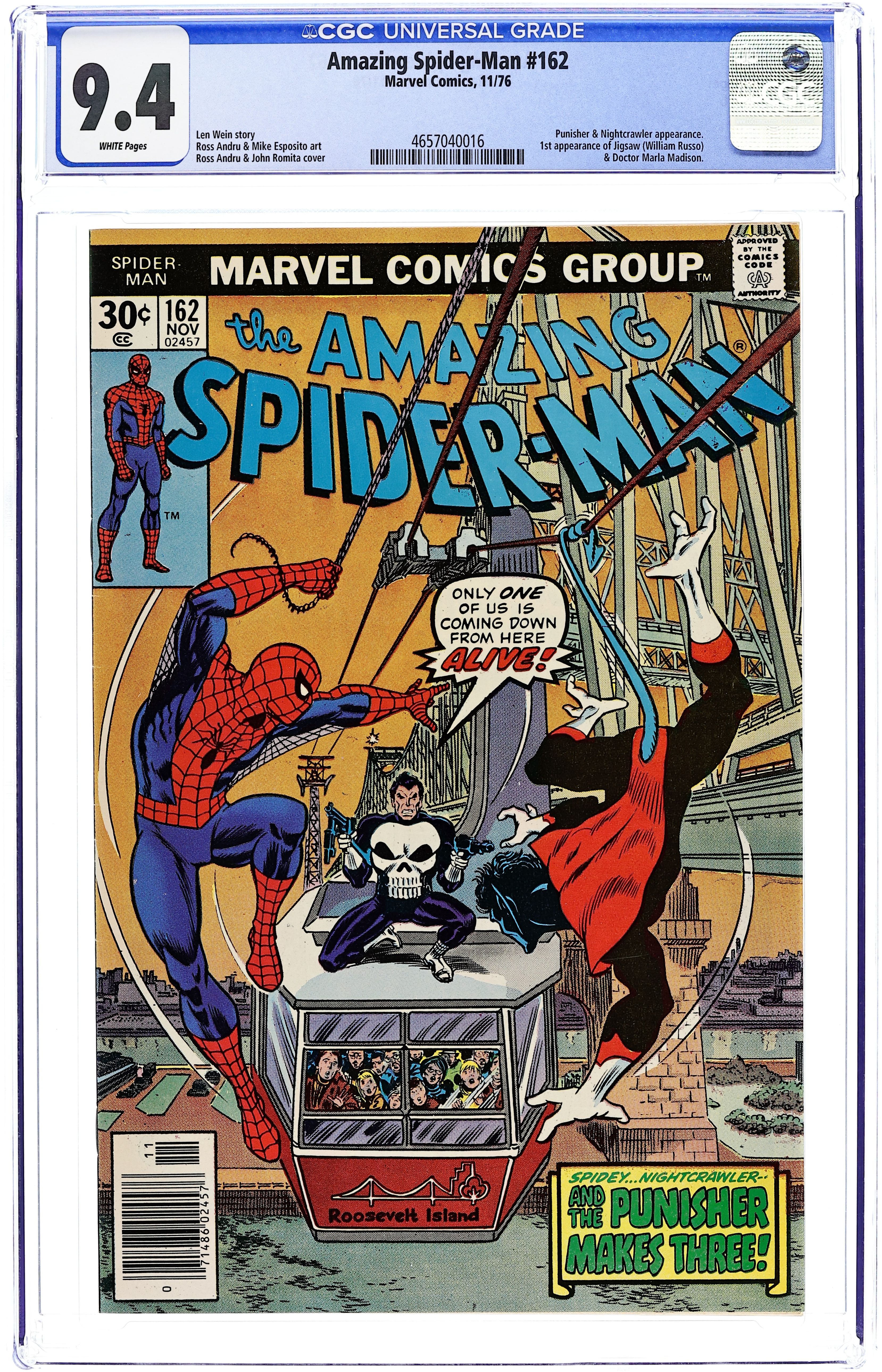Starts Dec 8 "Let the Punisher Fit the Crime!" Part 2 of 2. Guest-starring Nightcrawler and the Punisher. Script by Len Wein. Art by Ross Andru (breakdowns), Mike Esposito (finishes), and Dave Hunt (backgrounds). Cover by Ross Andru and John Romita. After a scuffle atop the Roosevelt Tramway; the Punisher, Nightcrawler, and Spider-Man come to a meeting of the minds! The trio realizes that none of them are the lethal sniper terrorizing the city! And they vow to catch the mysterious gunman before his next kill! Acting on a tip; the web-slinger, Punisher, and Nightcrawler converge on a street festival to smoke out the shooter! Can the heroes solve the killer's deadly puzzle? Or perhaps better stated...his Jigsaw puzzle? First appearances of Dr. Marla Madison and Jigsaw. Cameo appearances by Harry Osborn, Flash Thompson, Mary Jane Watson, and J. Jonah Jameson. (Notes: The Punisher appears next in Amazing Spider-Man 174. Jigsaw returns in Amazing Spider-Man 188. This story was reprinted in Marvel Tales 215.) 36 pages. Cover price $0.30. Grade: CGC 9.4 explanation of grade Condition: Used (collectible)