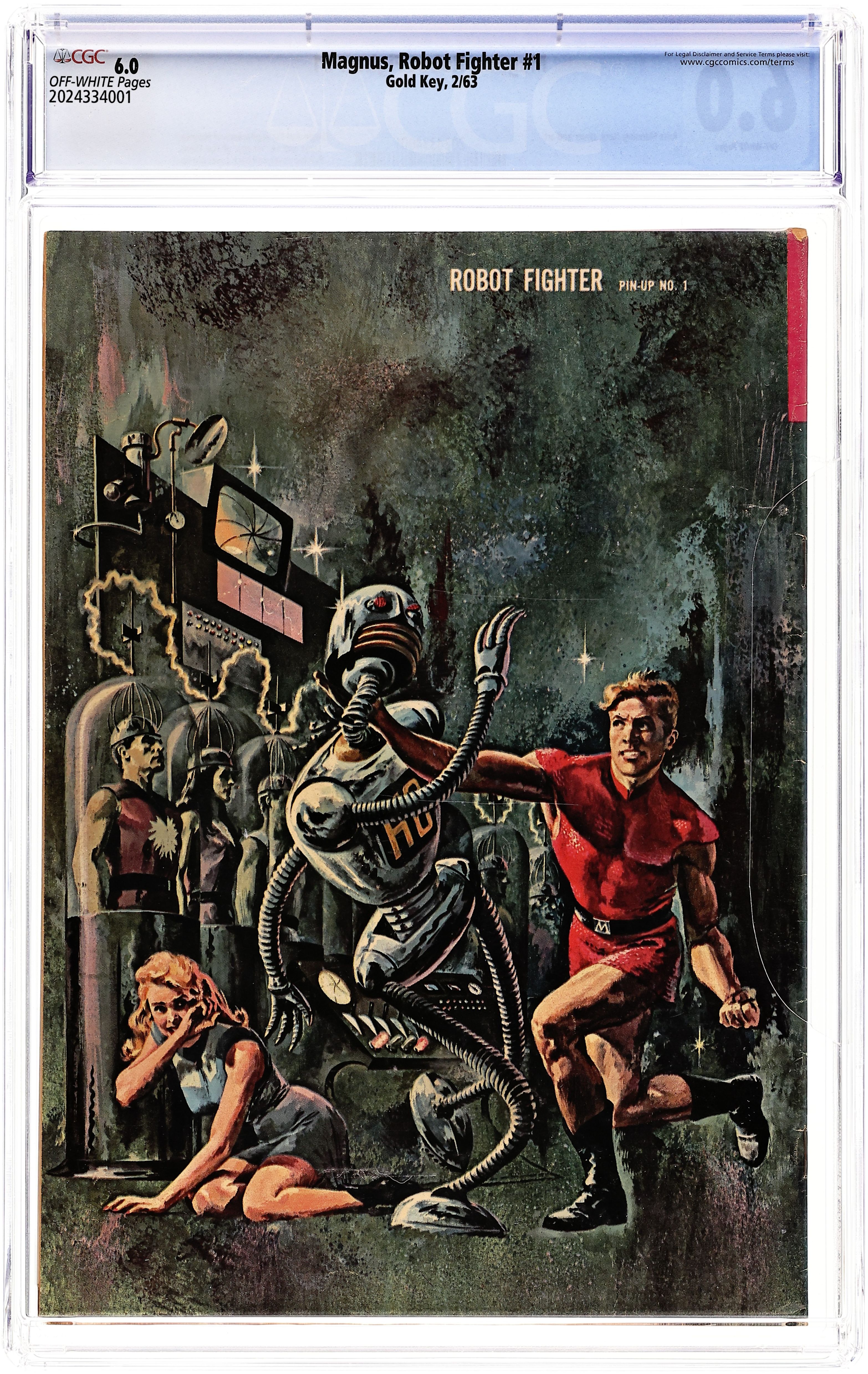 Starts Jan 3 Cover art by Russ Manning (sketch) and George Wilson (painted). Origin and first appearance of Magnus Robot Fighter in "Magnus, Robot Fighter," script and art by Russ Manning; 1A takes Magnus to North Am where he begins his crusade against evil robots by stopping the Polrob Chief H8. "The World of the Future" article on the prophecies of Nostradamus. "The Aliens," script and art by Russ Manning; For the first time, an Earth ship meets an alien ship, which attacks with missiles; The Earthmen would jump-drive for home, but the aliens follow; To safeguard Earth's location, Captain Johner must destroy the enemy; The aliens are saucer-headed loop-limbed giants captained by Zarz, who also must protect his planet. Robot Fighter Pin-Up No. 1on back cover, art by Russ Manning (sketch) and George Wilson (painted). # on cover 10046-302. February. #1 2/63. 36 pgs., full color. Cover price $0.12. Grade: CGC 6.0 explanation of grade Condition: Used (collectible)