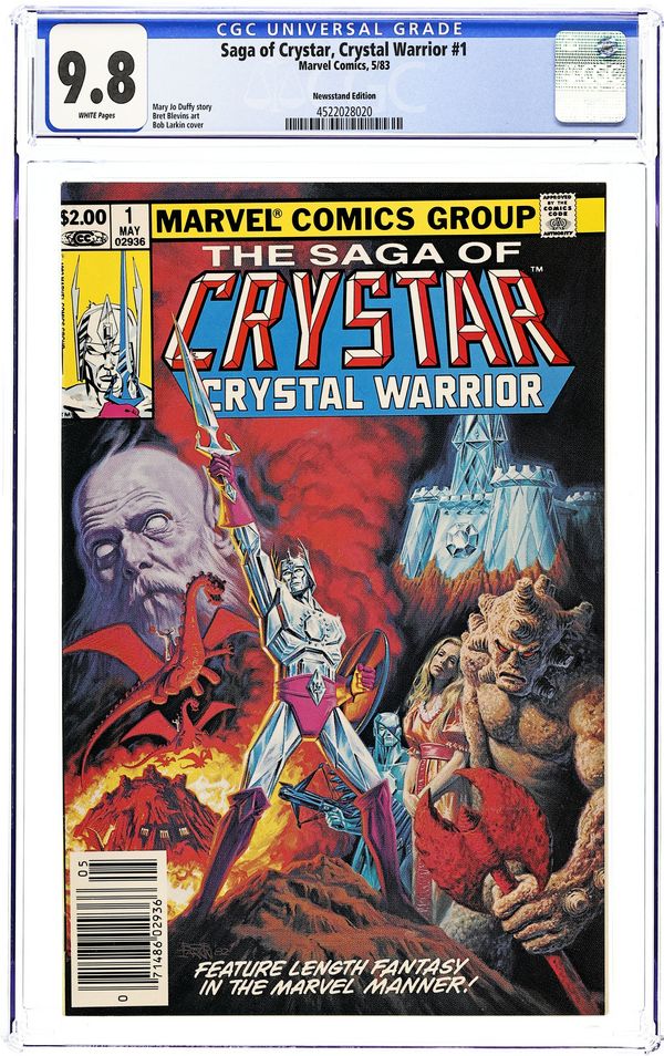 Newsstand Edition. "The Sundered Throne." This giant-sized first issue sets up the premise for the series, which evokes the fantasy and sword-and-sorcery of Conan the Barbarian. Crystar transforms to crystal while Moltar becomes magma, giving both princes special powers. Script by Mary Jo Duffy, pencils by Bret Blevins, inks by Andy Yanchus. Cover by Bob Larkin. Cover price $2.00. Grade: CGC 9.8 explanation of grade Condition: Used (collectible)