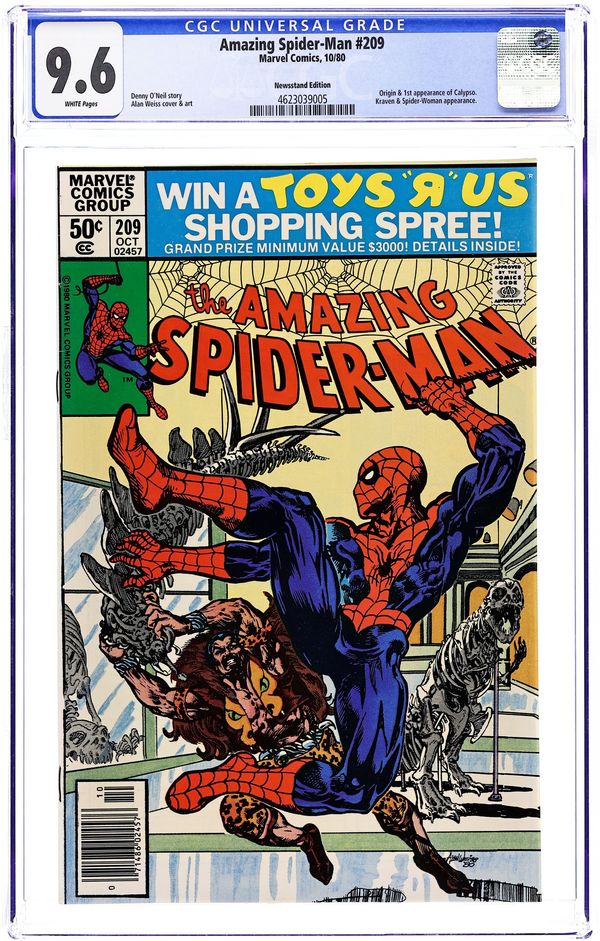 Newsstand Edition. "To Salvage My Honor!" First appearance of Calypso. Script by Denny O'Neil. Pencils by Alan Weiss. Inks by Klaus Janson, Bob McLeod, Joe Rubinstein, Bob Wiacek, and Al Milgrom. Cover by Alan Weiss. The specter of Spider-Man still haunts Kraven the Hunter! But Kraven's new accomplice, Calypso, has a plan to change that! While delivering a herd of exotic animals to the city, Calypso releases them to run wild in the streets! And then blames the web-slinger for setting them free! After Kraven subdues the loose animals, he vows to make the wall-crawler pay for this (alleged) indignity! And the next evening at the Museum of Natural History, the Amazing Spider-Man and Kraven the Hunter clash again! The survival of the fittest! Cameo appearance by Spider-Woman. (Note: Kraven and Calypso appear next in Spectacular Spider-Man 65.) 36 pages Cover price $0.50. Grade: CGC 9.6 explanation of grade Condition: Used (collectible)