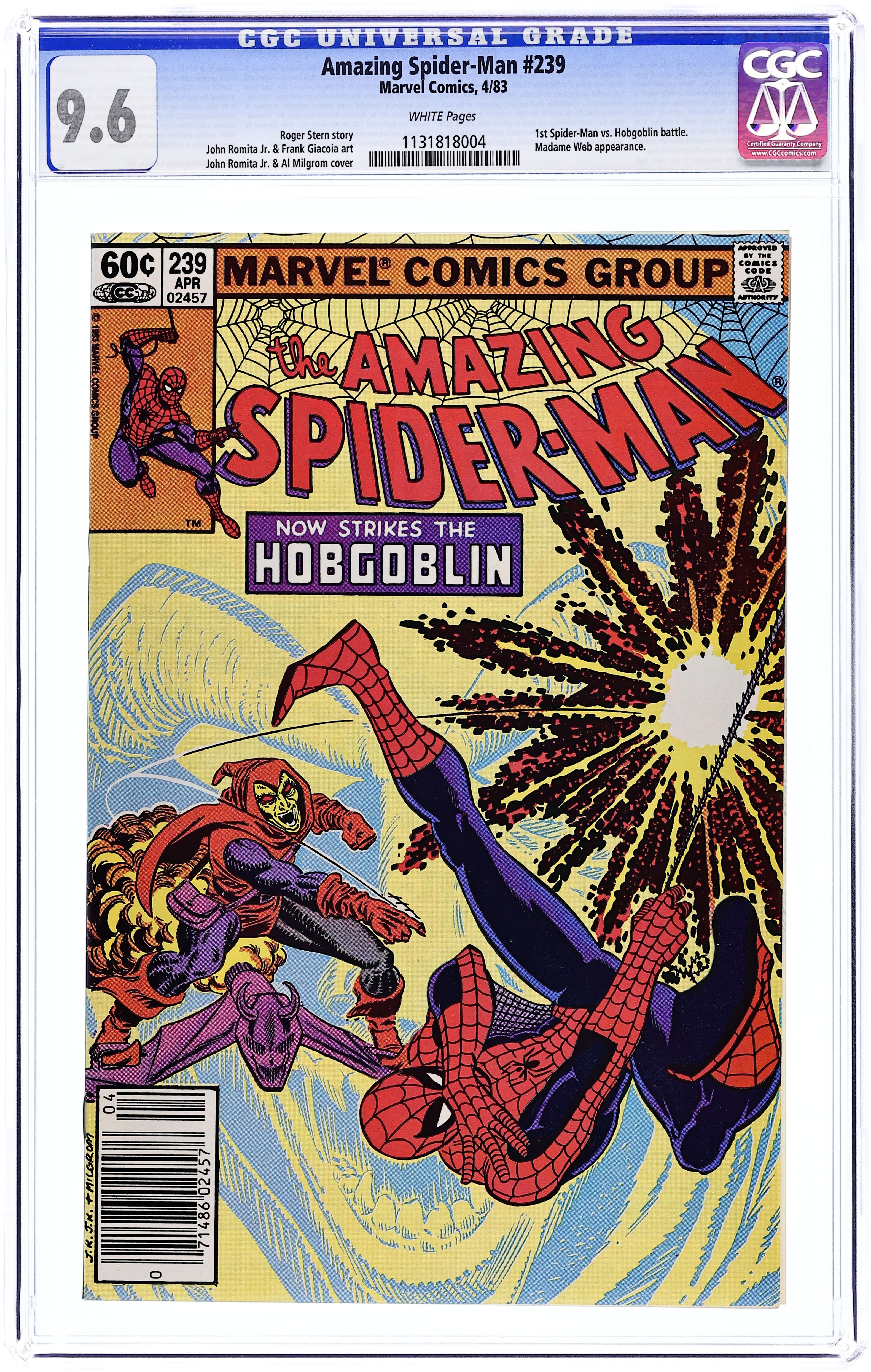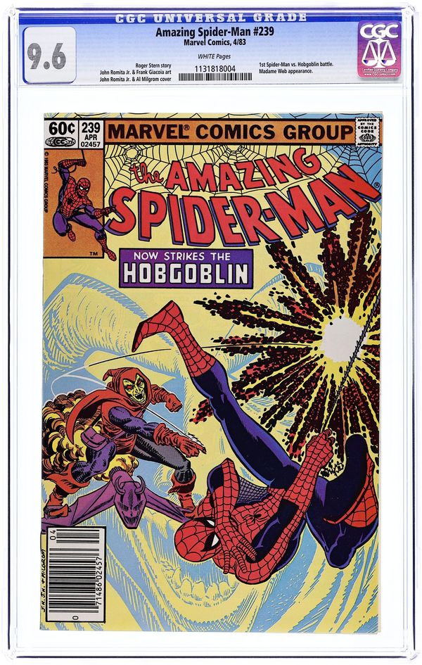 Newsstand Edition. "Now Strikes the Hobgoblin!" Second appearance of the Hobgoblin. Script by Roger Stern. Art by John Romita Jr. (breakdowns) and Frank Giacoia (finishes). Cover by John Romita Jr. and Al Milgrom. It's the first fight between the Hobgoblin and the Amazing Spider-Man! And the all-out action begins after the web-slinger bumps into the new goblin at one of Norman Osborn's old hideouts! Spidey is very familiar with the goblin's bag of tricks! But the overmatched Hobgoblin doesn't have any idea about the wall-crawler's speed, strength, and agility! Is the Hobgoblin's criminal career going to be over before it even starts? An outstanding issue! Cameo appearances by Harry Osborn, Madame Web, Captain DeWolff, and the Black Cat. (Notes: The Hobgoblin returns in Amazing Spider-Man 244. This issue was reprinted in Marvel Tales 258.) 36 pages. Cover price $0.60. Grade: CGC 9.6 explanation of grade Condition: Used (collectible)