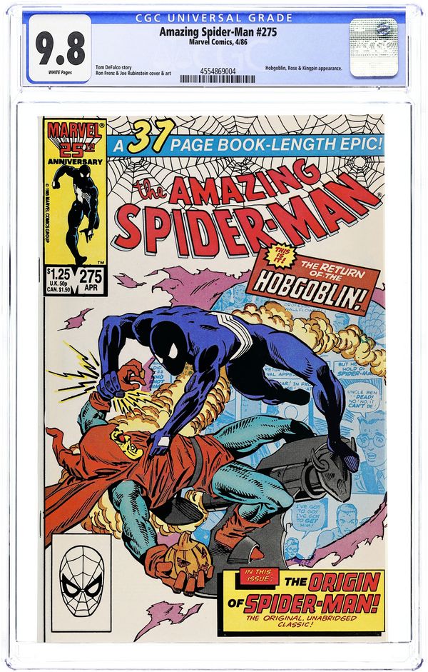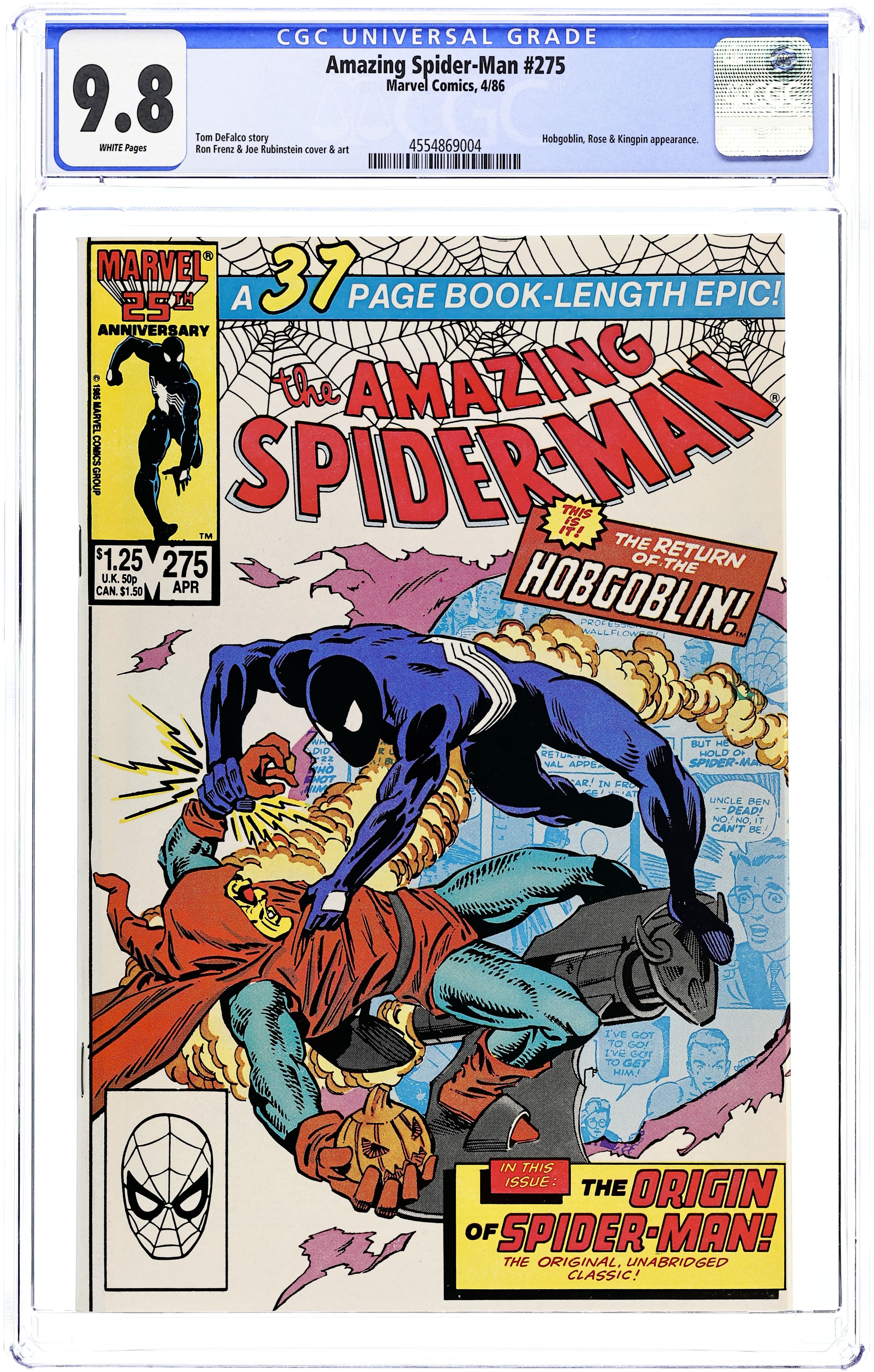 Direct Edition. "The Choice and the Challenge!" Part 1 of 2. Double-sized issue. Script by Tom DeFalco. Pencils by Ron Frenz. Inks by Joe Rubinstein. Cover by Ron Frenz and Joe Rubinstein. Affairs of the heart take center stage for Peter, Mary Jane, Betty, Ned, Flash, and Sha Shan as the long-time group of friends deal with a variety of relationship problems! But amid the soap opera-style drama, there is a super-villain on the prowl...the Hobgoblin! Armed with a new weapons system, the goblin circles the Port Authority Bus Terminal to draw out the web-slinger! Surprisingly the Hobgoblin's plan works! And then so does his new weapon! Is the goblin finally going to put Spidey down for the count? Cameo appearances by the Kingpin, Arranger, and Rose. Flashback cameos by the Green Goblin, Gwen Stacy, and the Sin-Eater. (Notes: Woven into the story are 11 (reprinted) pages of Spider-Man's origin from Amazing Fantasy 15. Script by Stan Lee. Art by Steve Ditko. On the cover the web-slinger and Hobgoblin break through a page from Amazing Fantasy 15. This issue was reprinted in Marvel Tales 283.)52 pgs. Cover price $1.25. Grade: CGC 9.8 explanation of grade Condition: Used (collectible)