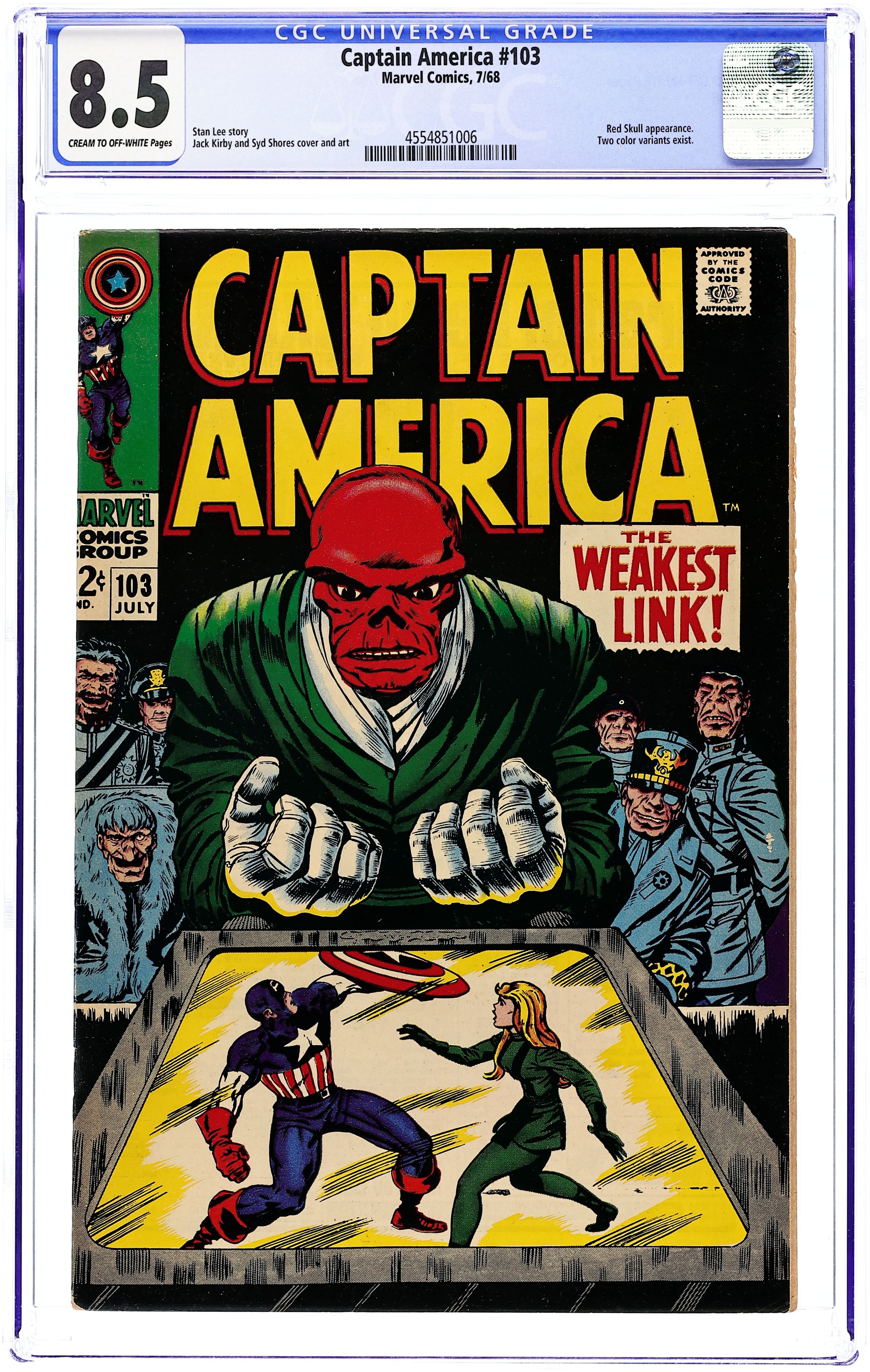 Cover pencils by Jack Kirby, inks by Syd Shores. "The Weakest Link!", script by Stan Lee, pencils by Jack Kirby, inks by Syd Shores; During a date with Agent 13, Captain America learns that her name is Sharon Carter; The date gets disrupted by the Red Skulls minions, who defeat Cap and take Sharon to Exile Island; The Red Skull and the Exiles force two of their slaves to battle one other; Sharon Carter's name is revealed in this issue. (Previously she was known as Agent 13.)36 pgs., full color. $0.12. Cover price $0.12. Grade: CGC 8.5 explanation of grade Condition: Used (collectible)