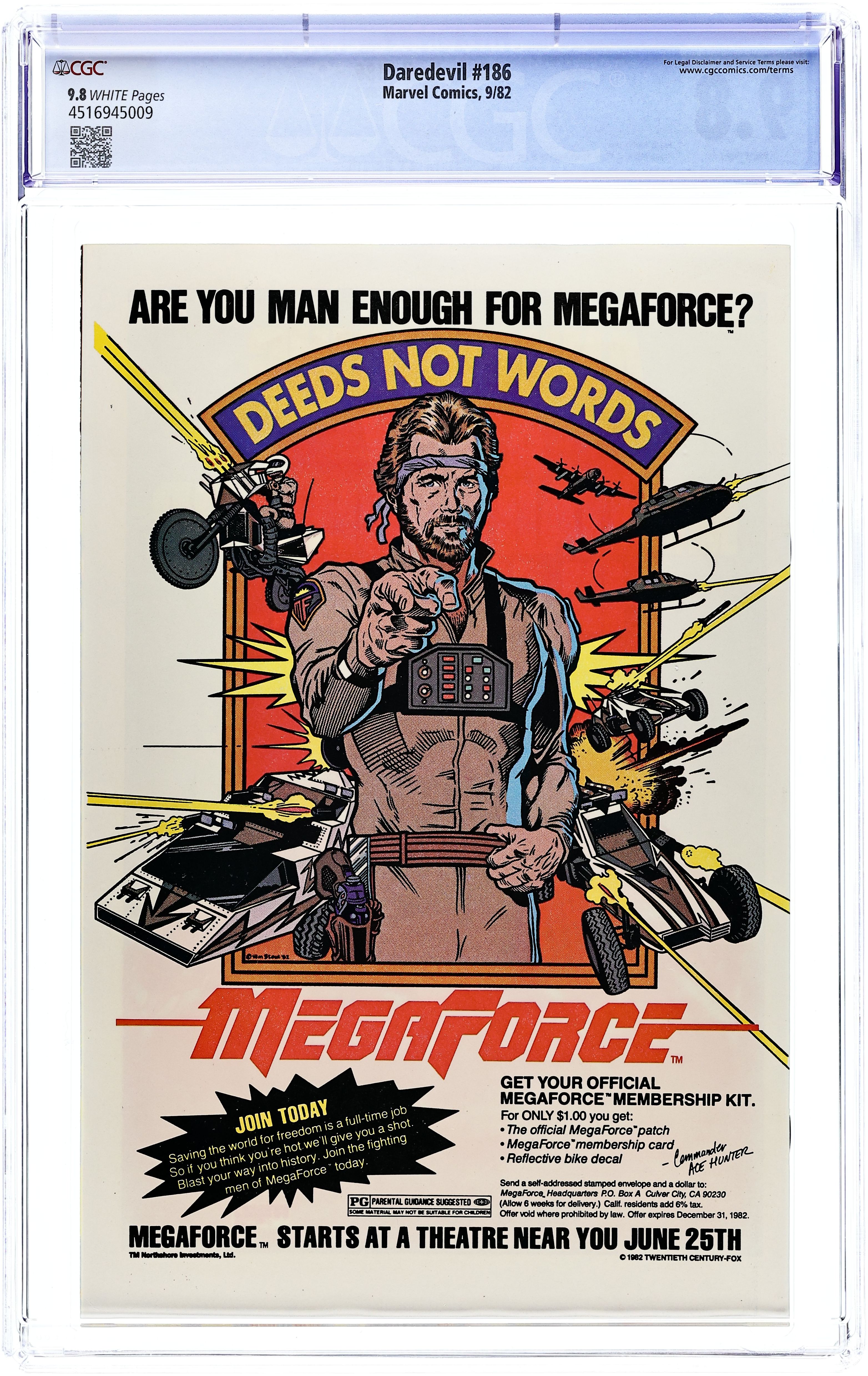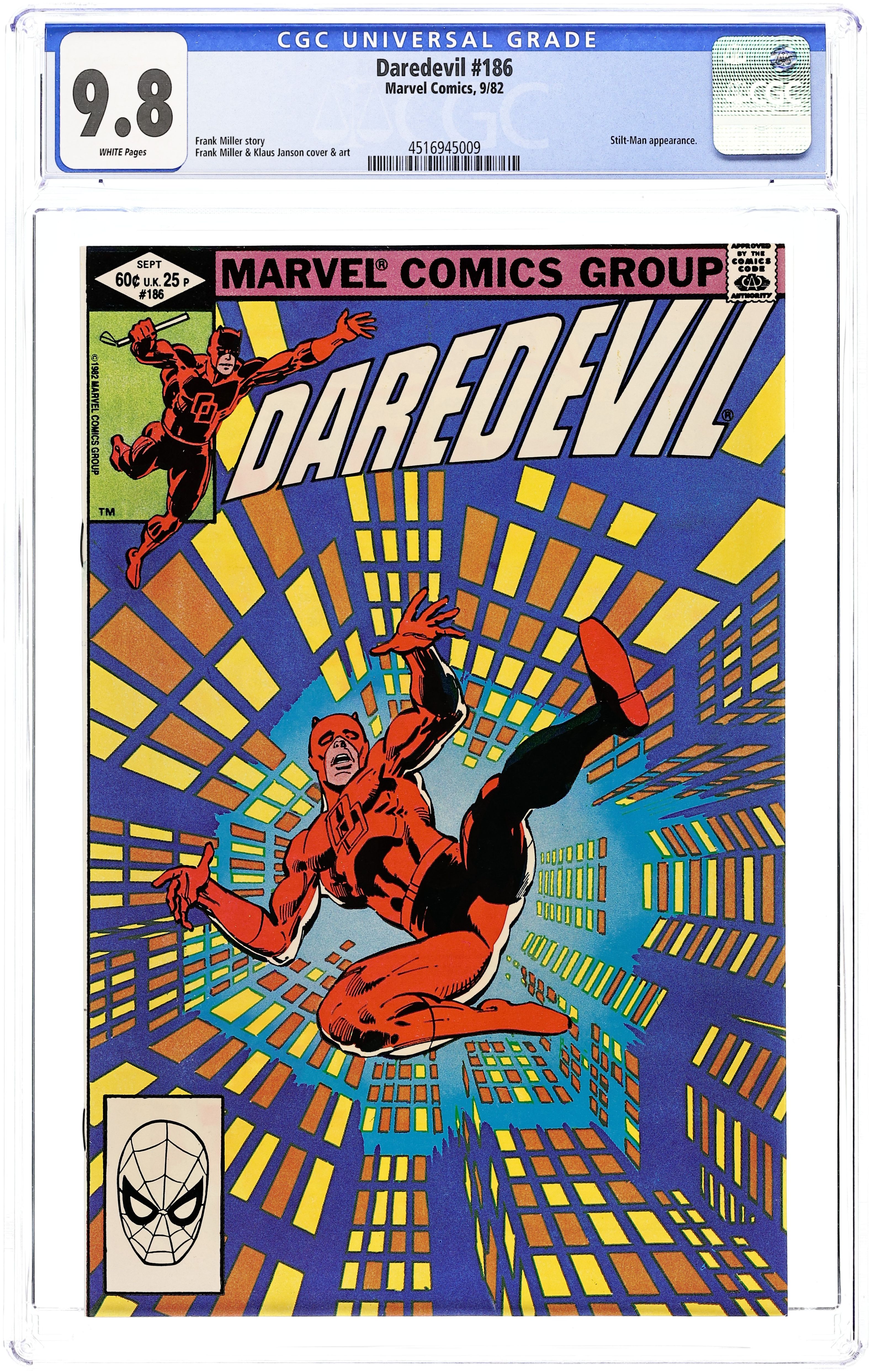 Cover pencils by Frank Miller, inks by Klaus Janson. Turk becomes the new Stilt Man in Stilts, script by Frank Miller, pencils by Frank Miller (layouts) and Klaus Janson (finished art), inks by Klaus Janson; Matt begins gathering criminal evidence to sink Glenn industries; Turk steals the Stilt Man armor and tries to prove himself to the Kingpin (and fails miserably); DD's hyper senses start going wild; Matt pressures Heather into accepting his proposal of marriage; Gladiator appearance. Back cover MegaForce art by William Stout. 36 pgs. Cover price $0.60. Cover price $0.60. Grade: CGC 9.8 explanation of grade Condition: Used (collectible)
