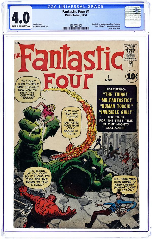 Cover pencils by Jack Kirby, inks by George Klein. The issue that started the Marvel Age of comics. First appearance of Mr. Fantastic, the Thing, the Human Torch (Johnny Storm), and the Invisible Girl as they battle the Mole Man in "The Fantastic Four!", script by Stan Lee, pencils by Jack Kirby, inks by George Klein; Dr. Reed Richards takes his friends on a rocket trip that changes their lives forever. The Fantastic Four Meet the Mole Man!, script by Stan Lee, pencils by Jack Kirby, inks by George Klein; Atomic plants disappear all around the world; Reed Richards pinpoints a place which is at the same distance from them all: Monster Isle. The Moleman's Secret!, script by Stan Lee, pencils by Jack Kirby, inks by George Klein; Having captured the Fantastic Four, Moleman recounts how he discovered his underground kingdom. 36 pgs. $0.10. Cover price $0.10. Grade: CGC 4.0 explanation of grade Condition: Used (collectible)