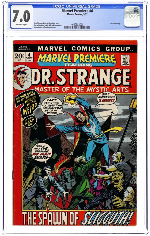 Starts Dec 15 Cover pencils by Barry Smith, inks by Tom Palmer. The Spawn of Sligguth, script by Archie Goodwin and Roy Thomas (plot), pencils by Barry Smith, inks by Frank Brunner; Ethan Stoddard asks help for his fiancee who has fallen prey to the cult of Sligguth in Starksboro; The Ancient One warns Strange of a Cosmic Obscenity that slumbers; Strange is overcome by Sligguth's worshippers. Featuring concepts created by Robert E. Howard. 36 pgs. $0.20. Cover price $0.20. Grade: CGC 7.0 explanation of grade Condition: Used (collectible)