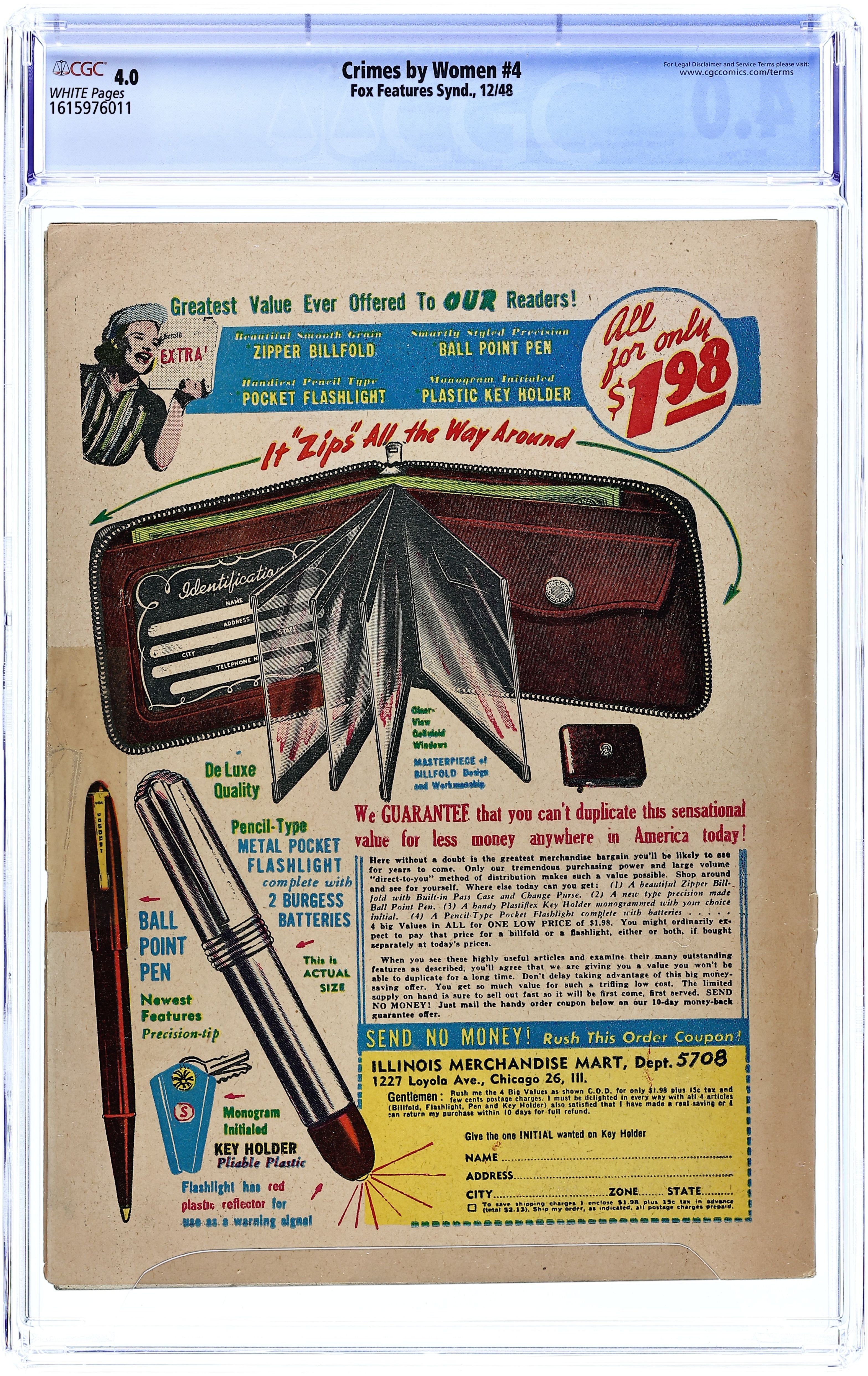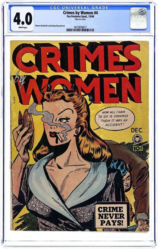 Starts Jan 3 Art by Warren Broderick, T. Ward and Jimmy Maxwell. Fox Feature Syndicate creates a pre-Code title guaranteed to provide lurid covers and art, as women both historical and fictional commit murder and other heinous acts. Kitty Sarlo and her crony Sam hatch a scheme to get hapless soldiers drunk and then rob them; Foul-mouthed but beautiful Nellie turns to murder when a safecracking job goes wrong; Actress Connie Hale gets involved in a diamond-smuggling racket. Kitty Sarlo: The Female Leech; Nitro Nellie: The Savage Safe-Smashers; The Diamond of Kor-el-Maninoor; Man Trap. 32 pages, Full Color. All stories reprinted in Crimes by Women (1948) #54. In order of appearance: "Kitty Sarlo, The Female Leech"; "Nitro Nellie, The Savage Safe-Smashers"; and "Man Trap". "The Diamond of Kor-El-Maninoor" text story also reprinted in Zoo Funnies (1953 2nd Series Capitol/Charlton) #13. Cover price $0.10. Grade: CGC 4.0 explanation of grade Condition: Used (collectible)