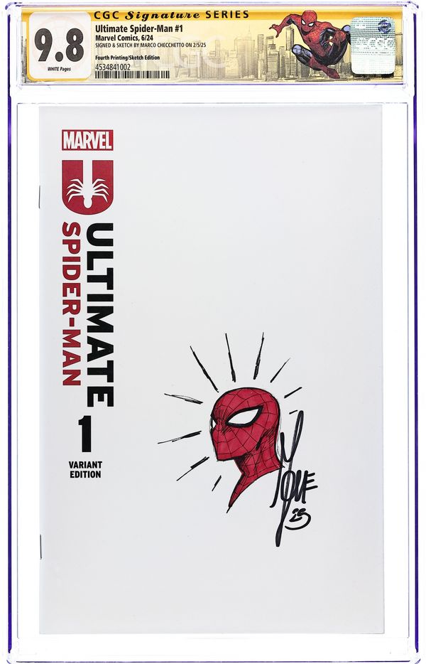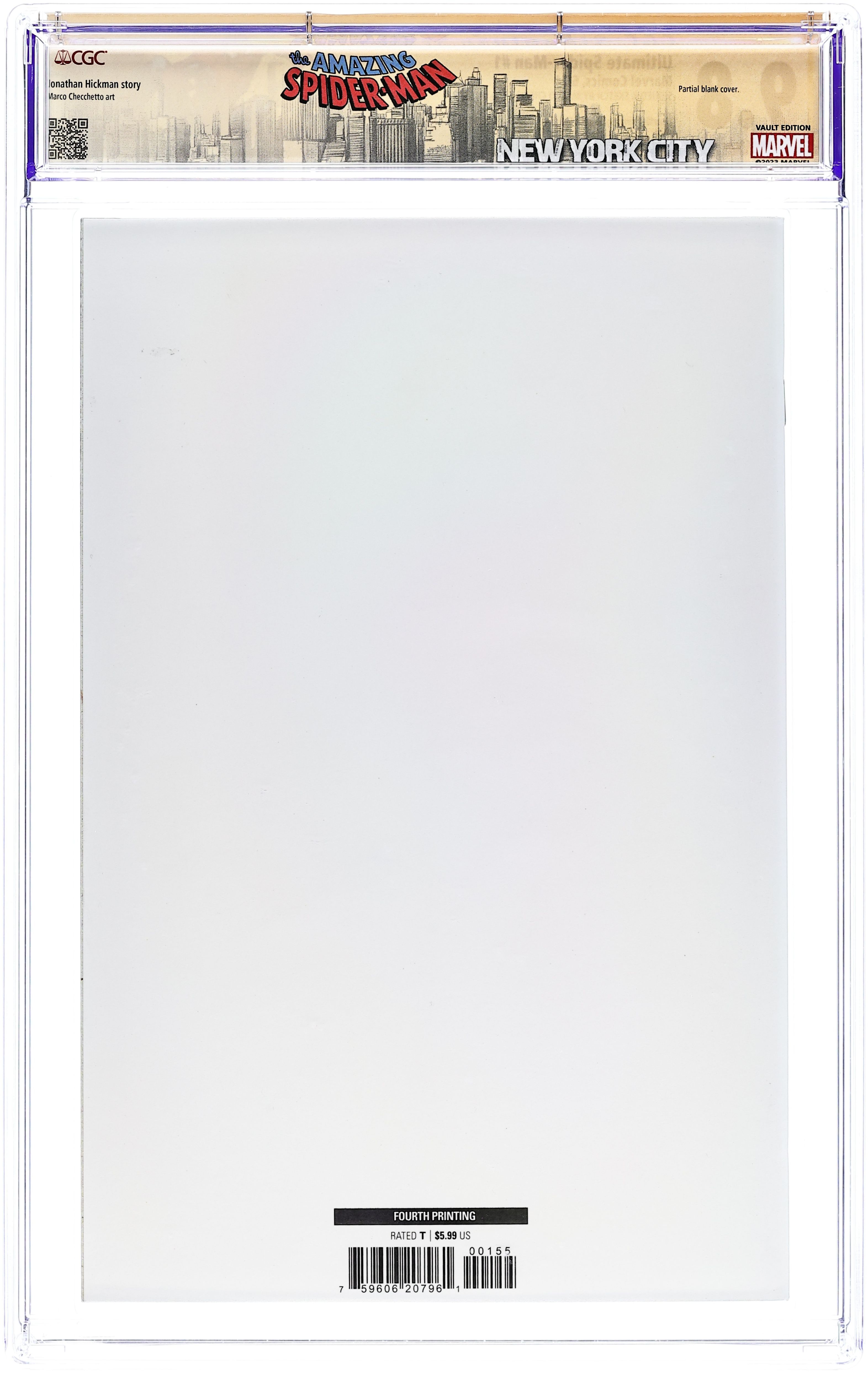 Starts Jan 3 4th Printing. Written by Jonathan Hickman. Art by Marco Checchetto. Cover by Blank Sketch Cover. THE NEW ULTIMATE SPIDER-MAN FOR A NEW ULTIMATE UNIVERSE! After the events of ULTIMATE INVASION, the world needs a hero...who will rise up to take on that responsibility? Prepare to be entangled in a web of mystery and excitement as the all-new ULTIMATE SPIDER-MAN comic redefines the wall-crawler for the 21st Century! 46 pages, full color. Rated T Cover price $5.99. Grade: CGC 9.8 explanation of grade Condition: Used (collectible) unless item is a new release